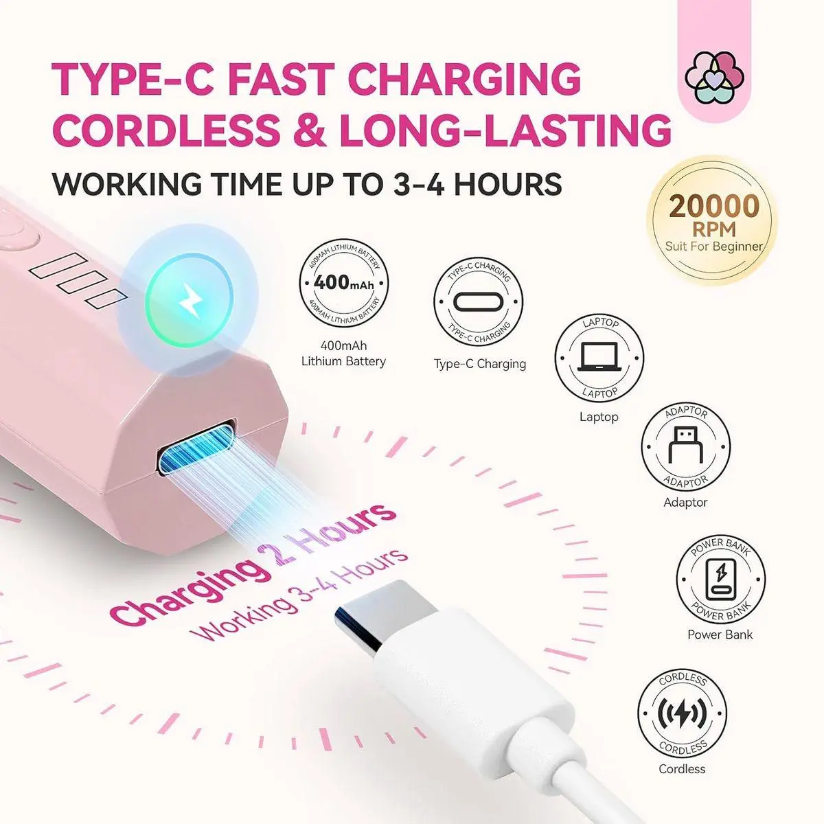 Rechargeable & Long-lasting: The SAVILAND Electric Nail Drill features a 400mAh lithium battery with a Type-C charging port, fully charging in 2 hours. It offers 3-4 hours of continuous operation for convenient manicures without the hassle of cables.