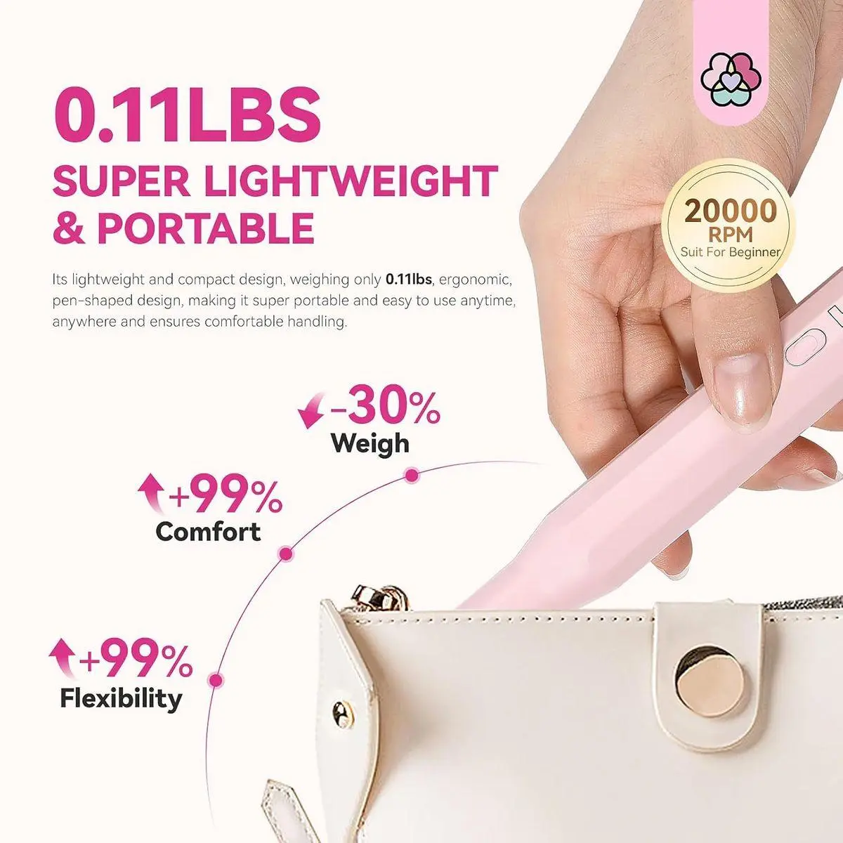 Portable & Cordless: The flawless nail drill pen, weighing only 0.11lbs, is lightweight and compact for easy portability. Its ergonomic, pen-shaped design offers a comfortable grip for extended use without fatigue. Enjoy professional manicures on-the-go with flexibility and comfort.