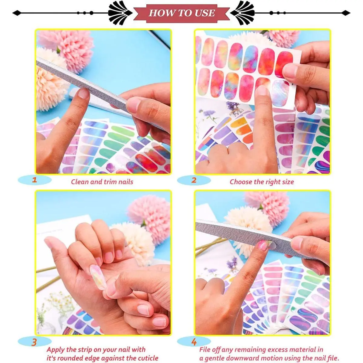 Specific Information-These full wrap nail stickers are made from removable self-adhesive resin material, non-toxic and odor, no harm for your nail and skin. Each sheet of full wrap nail sticker measures approx. 10 x 5.5 cm/ 4 x 2.2 inches, lightweight and convenient to carry and store without taking up much space.