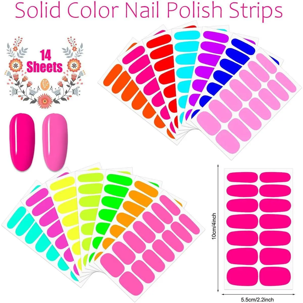 14 Fluorescence Nail Wraps-14 sheets fluorescence nail polish strips in different sizes and colors, fashionable and elegant, 14 pieces of each sheet, totally 196 pieces, sufficient to meet your DIY nail art decoration needs, comes with 1 piece moon shape nail file, can bring much convenience to the DIY process.