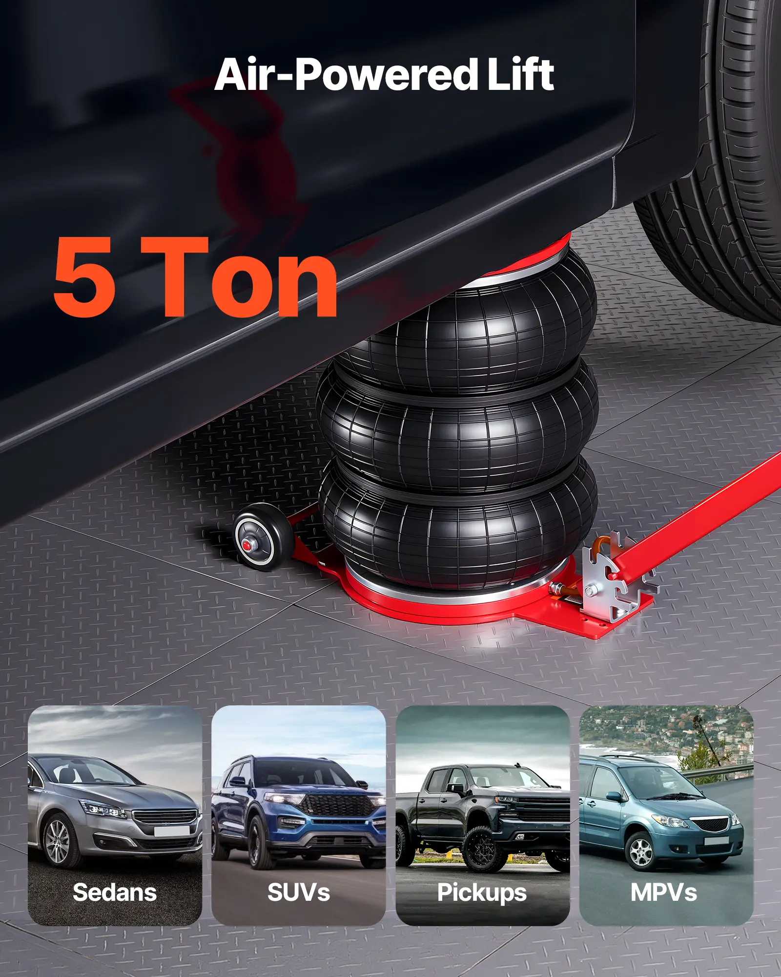 5-Ton Heavy Load Capacity: This airbag jack supports up to 5 tons/11023 lbs, suitable for sedans, SUVs, pickups, and trucks. Its reinforced triple-layer airbag and widened base plate ensure strong, stable lifting performance