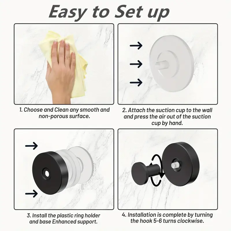 ·Clean the surface, press and twist to lock—no tools or screws needed. Includes adhesive discs for optional use. Easily removable and leaves no residue.