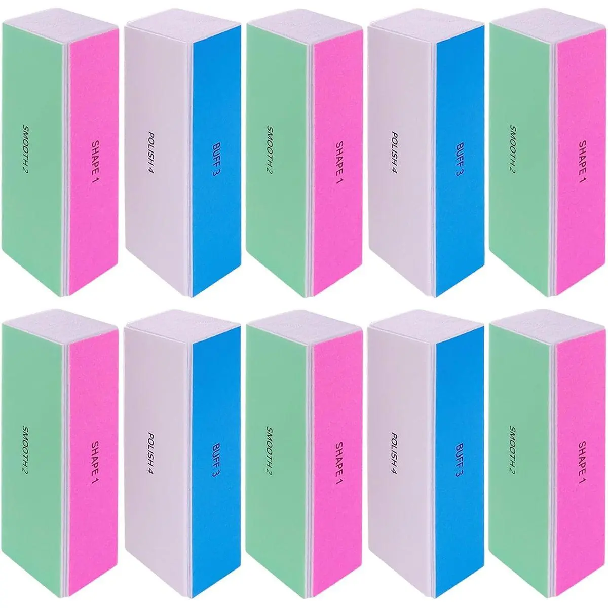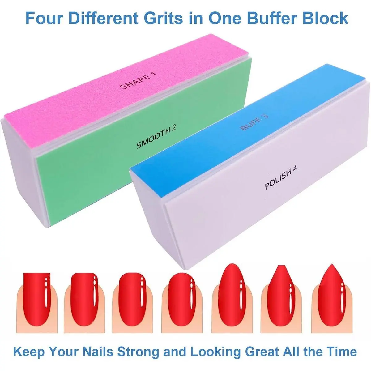 Get Shiny Nails in Just Four Steps: Our 4 sided nail buffer block features one 120 grit pink side to file down and shape nails, one 240 grit on green side to smooth and even out nail surfaces, one 600 grit blue side to buff nails, and one 3000 grit white sides to polish and give you super glossy natural or acrylic nails; Use our nail buffer for natural nails or artificial nails for perfect results every time;