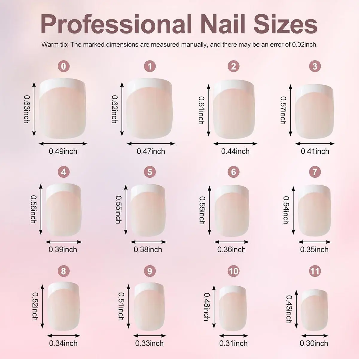 Christmas press on nails kit includes: 5set 120pc white french tip press on nails, 5 sheets nail adhesive tabs, 1 mini file, 1 wooden stick, 1 alcohol pad. The #0 about 0.49inch width, #11 about 0.30inch width.