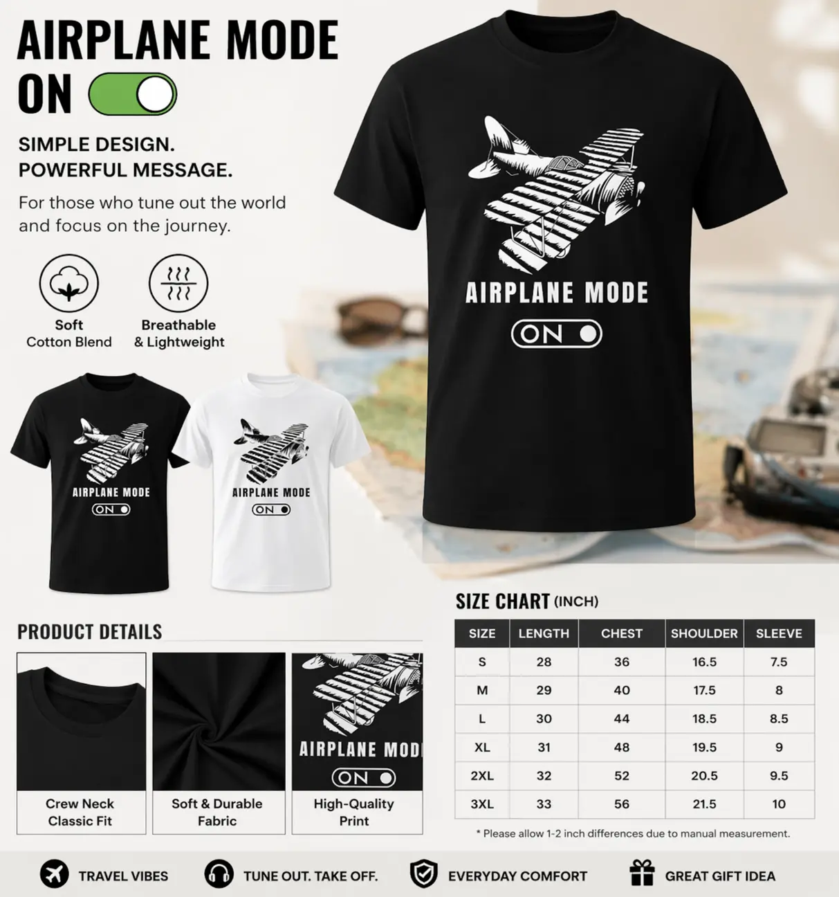 This “Airplane Mode On” graphic tee is made for people who know when to disconnect and enjoy the moment. Featuring a bold vintage airplane design with a clean toggle icon, this shirt blends humor, style, and personality into one standout piece.
