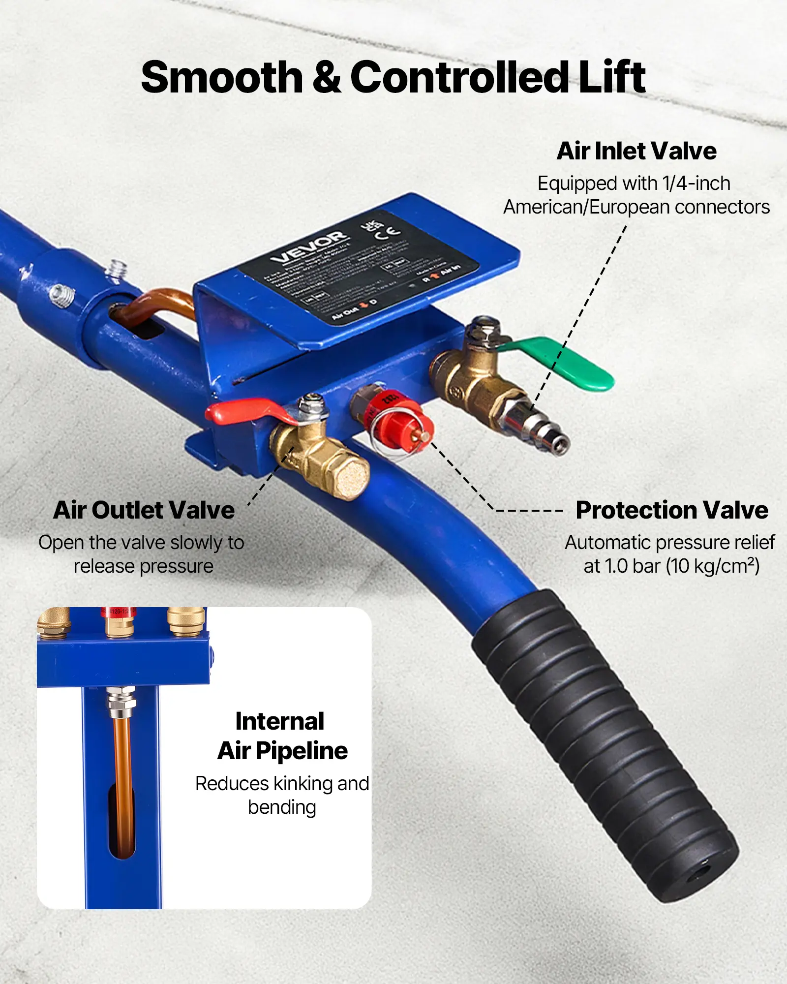 Controlled & Safe Descent: The air bag jack features six heavy-duty steel pipes inside, each with a shorter stroke for smooth, steady lowering and precise height control. It stops sudden drops, distributes weight evenly, and avoids deformation or tilting