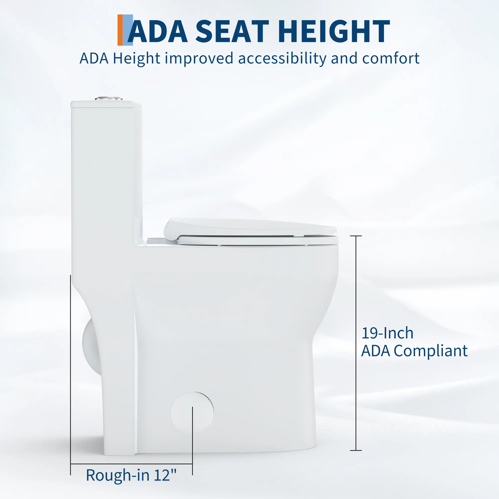 ·19-Inch ADA Comfort Height for Enhanced Accessibility With a chair-height seating position of 19 inches from the floor, this toilet meets ADA compliance standards, making sitting down and standing up significantly easier for adults, seniors, and tall individuals.