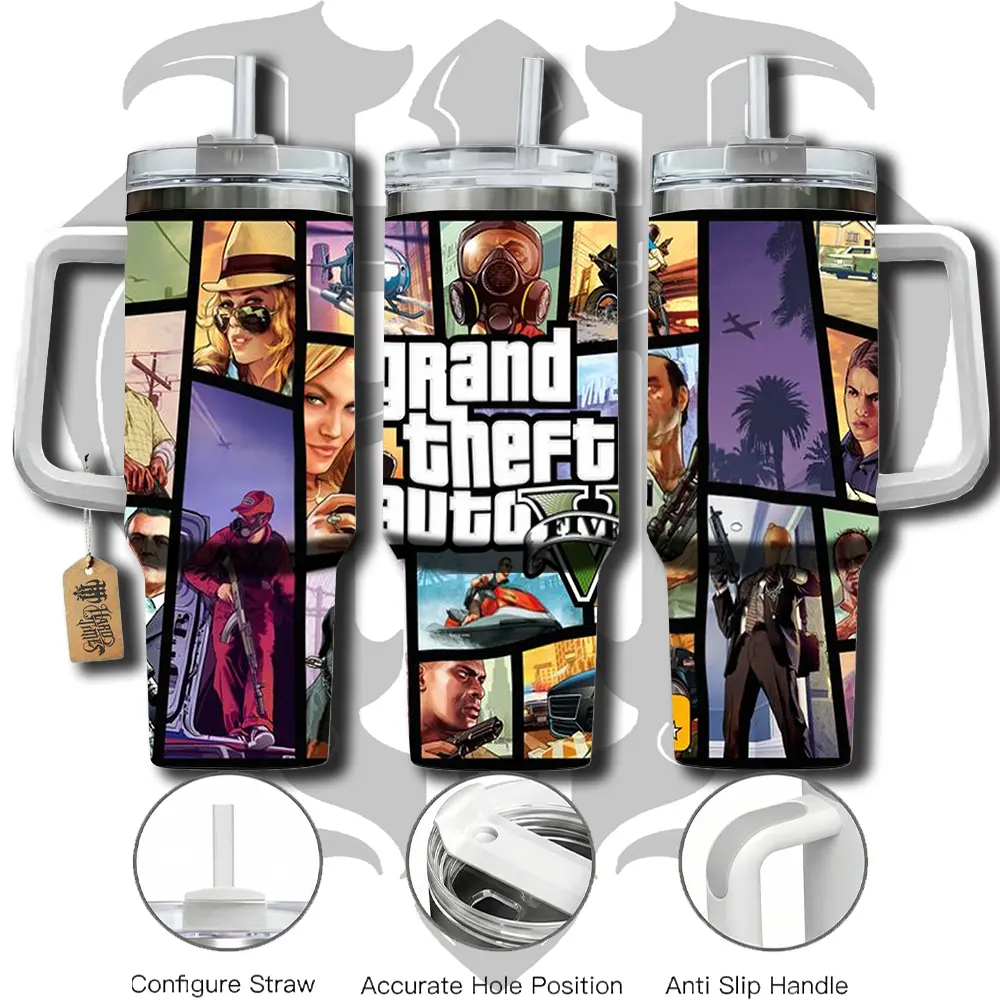HardTimesMerch - Grand Theft Auto V #1 40oz Handle Tumbler Stainless Steel Travel Mug, Game Inspired Vacuum Insulated Cup, Large Iced Coffee Tumbler, Manga Fighter Drinkware, Gamer Gift for Him Her