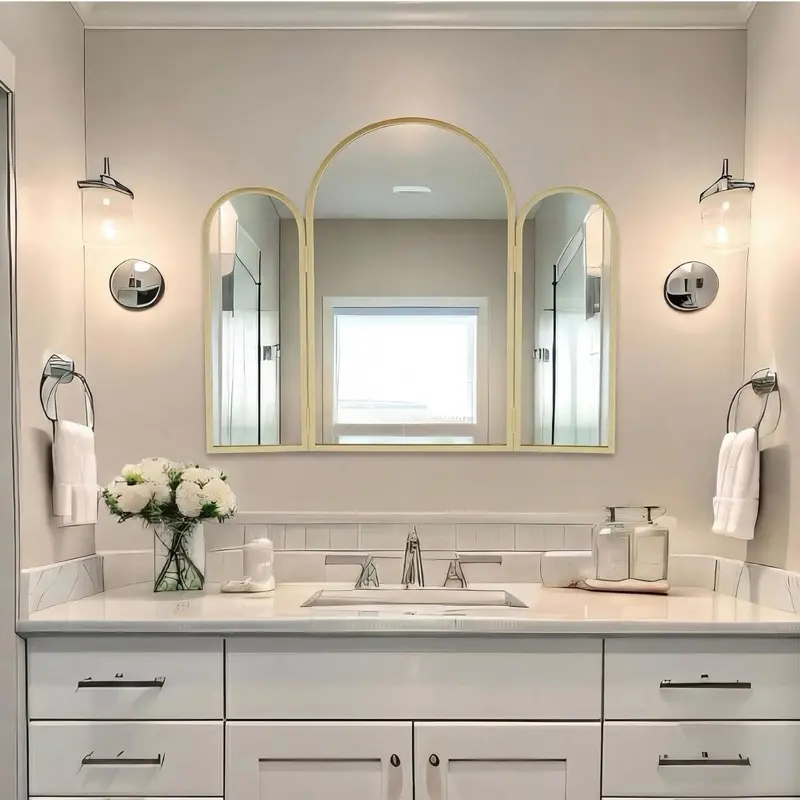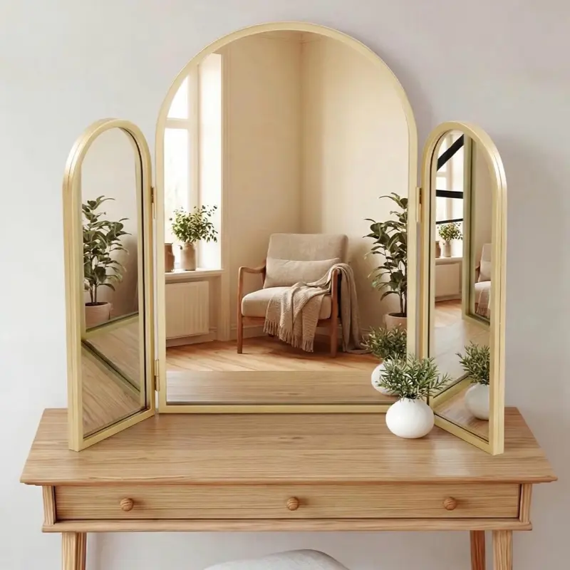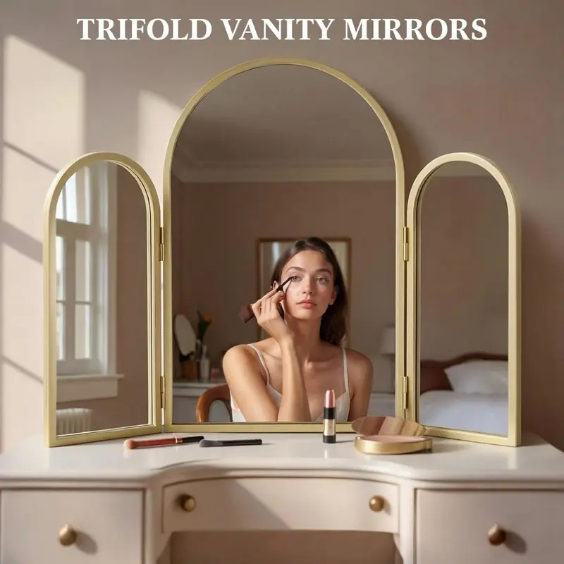 ·Artistic Ambiance: create an ambiance that speaks of art and elegance with the trifold vanity mirror's arched design; The gold frame provides a touch of glamour, making it a stunning decorative wall mirror for living rooms, dining areas, home, commercial settings, ideal for bridal shops, boutiques, and home dressing rooms