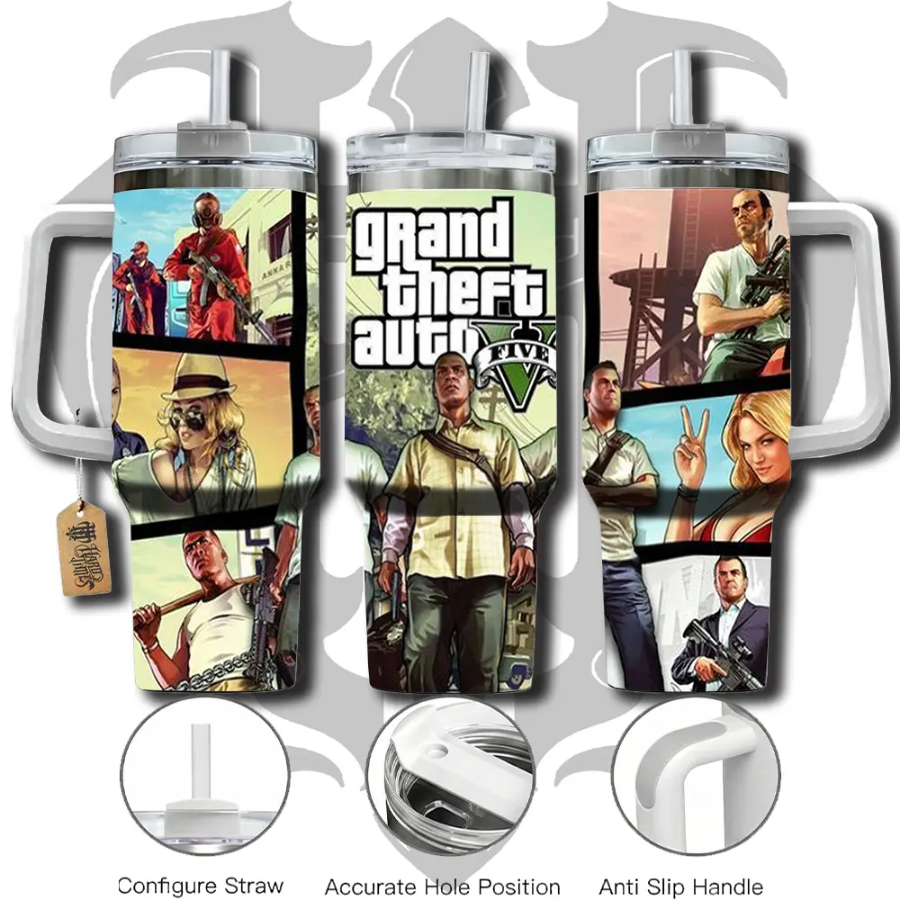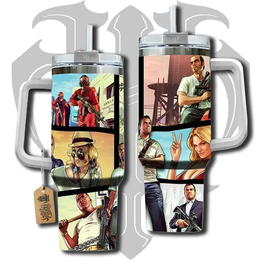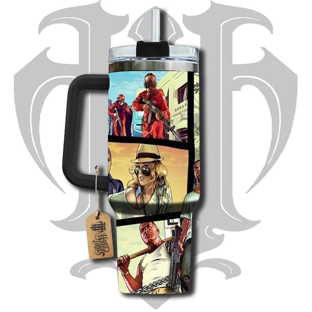 HardTimesMerch - Grand Theft Auto V #3 40oz Handle Tumbler Stainless Steel Travel Mug, Game Inspired Vacuum Insulated Cup, Large Iced Coffee Tumbler, Manga Fighter Drinkware, Gamer Gift for Him Her