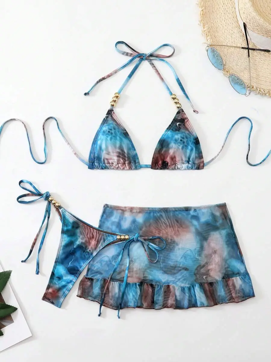 HIBOMARI 3pcs Set Tie-Dye Print Beaded Halter Top Swim Bottoms And Mini Skirt Bikini Set