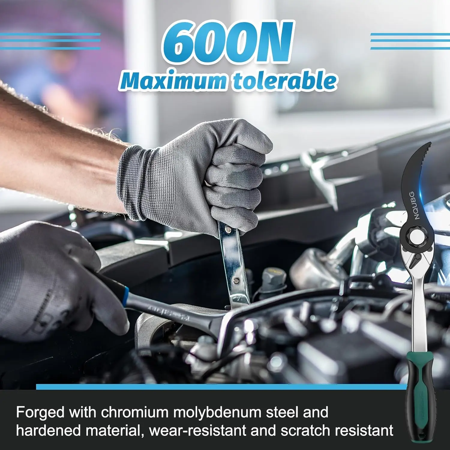 This pry bar wrench adapter is built from durable alloy steel, ensuring long-lasting use and reliable performance in various auto repair tasks.