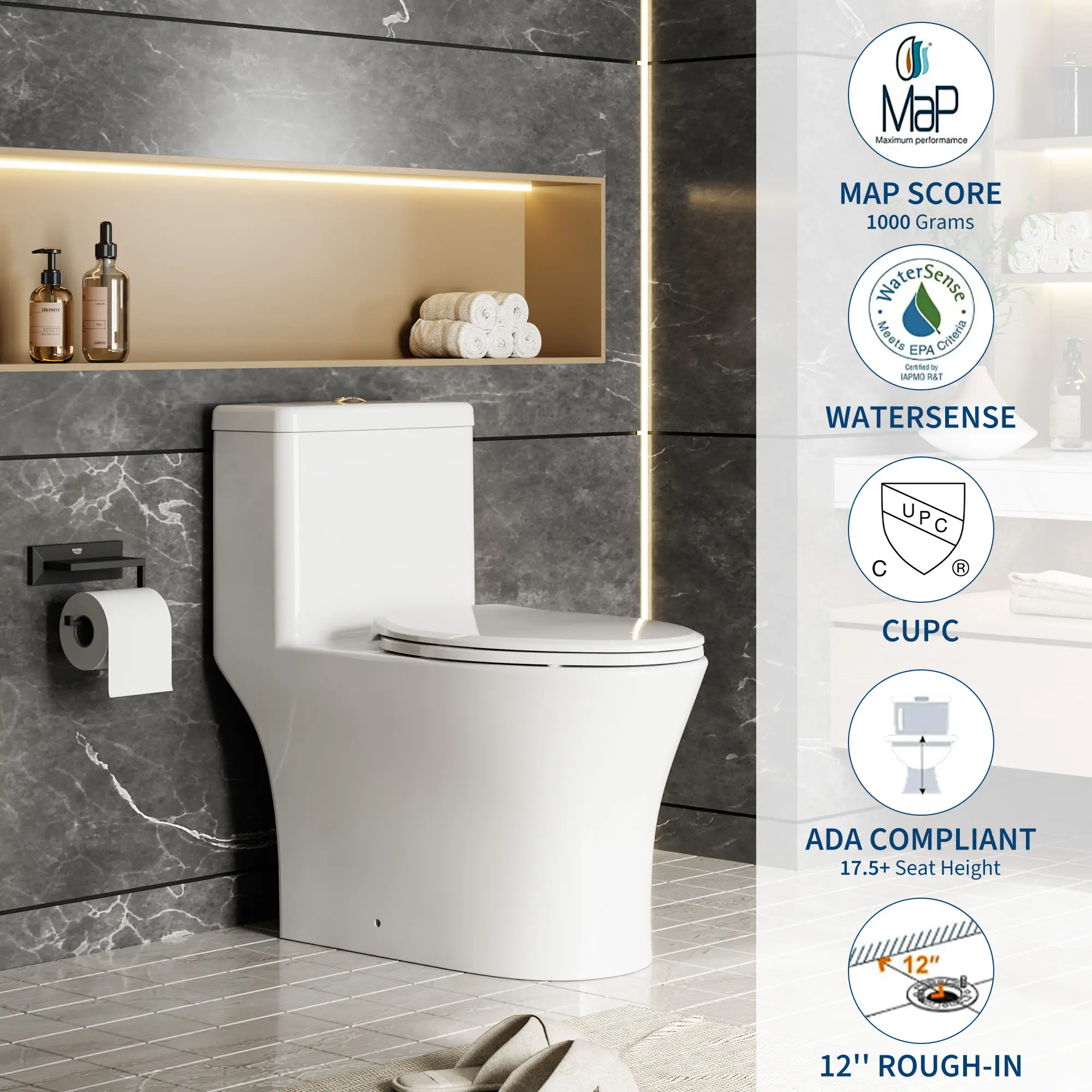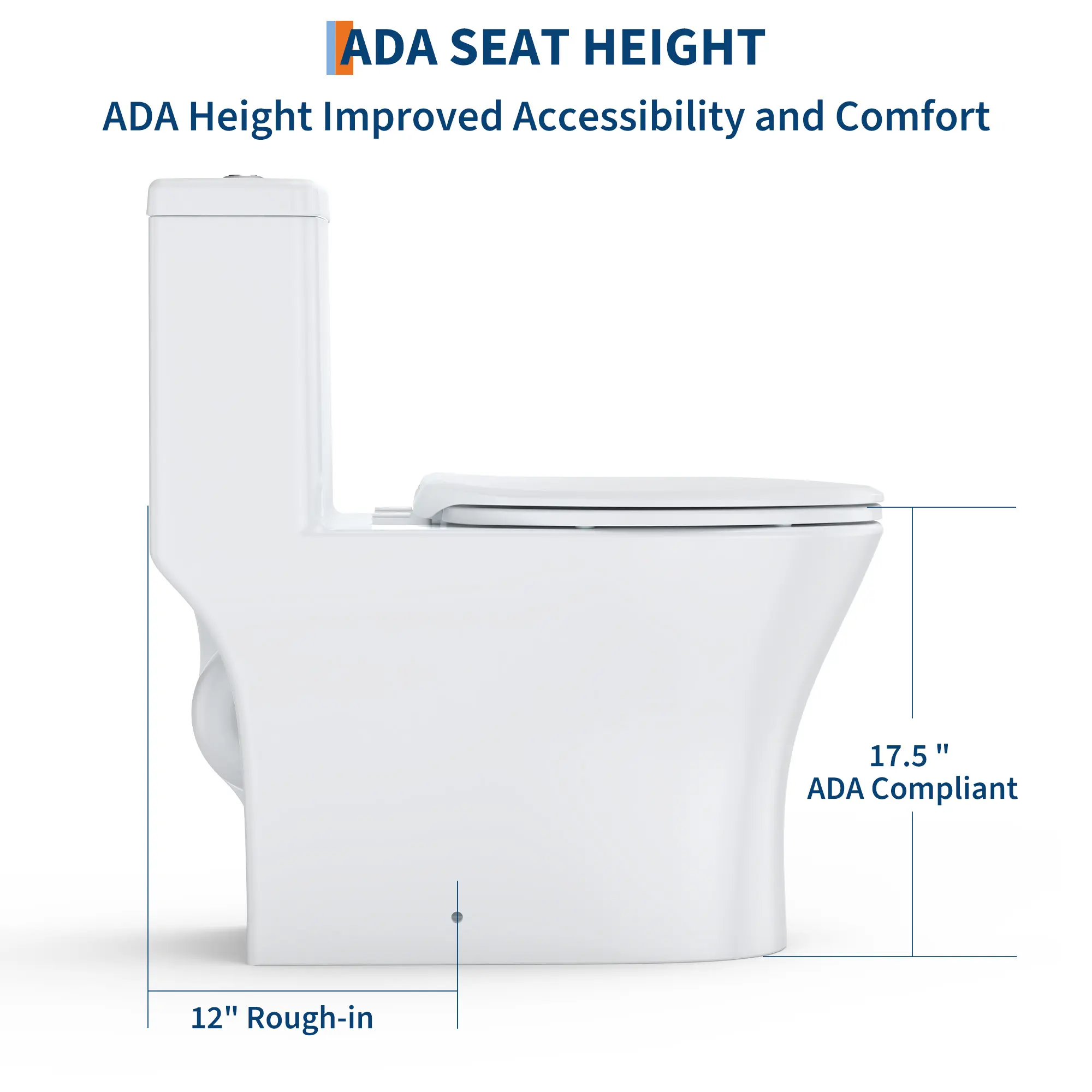 ·Designed with bowl at a comfort height that complies with ADA guidelines. This ergonomic design provides enhanced comfort and makes sitting down and standing up easier for adults, seniors, and tall individuals, ensuring universal accessibility.