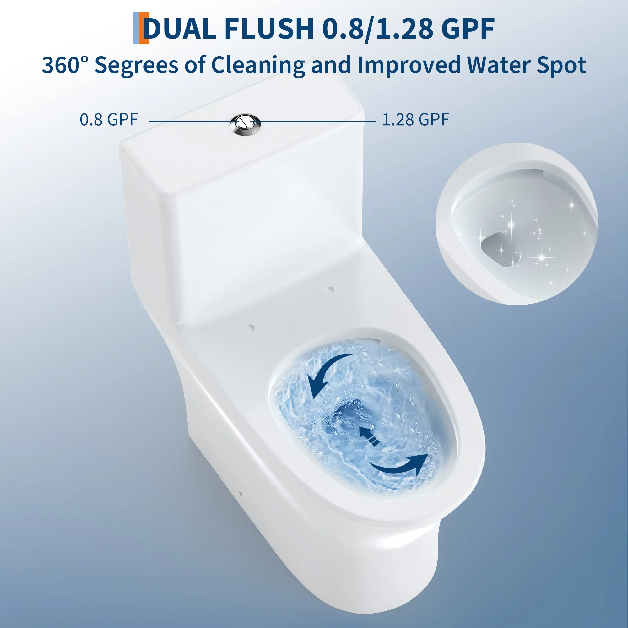 ·Superior Flushing: One-Piece Toilet is designed with an press-flush mechanism ensures a powerful and efficient flush every time. 360-degree cleaning with powerful flush that clears waste with ease.