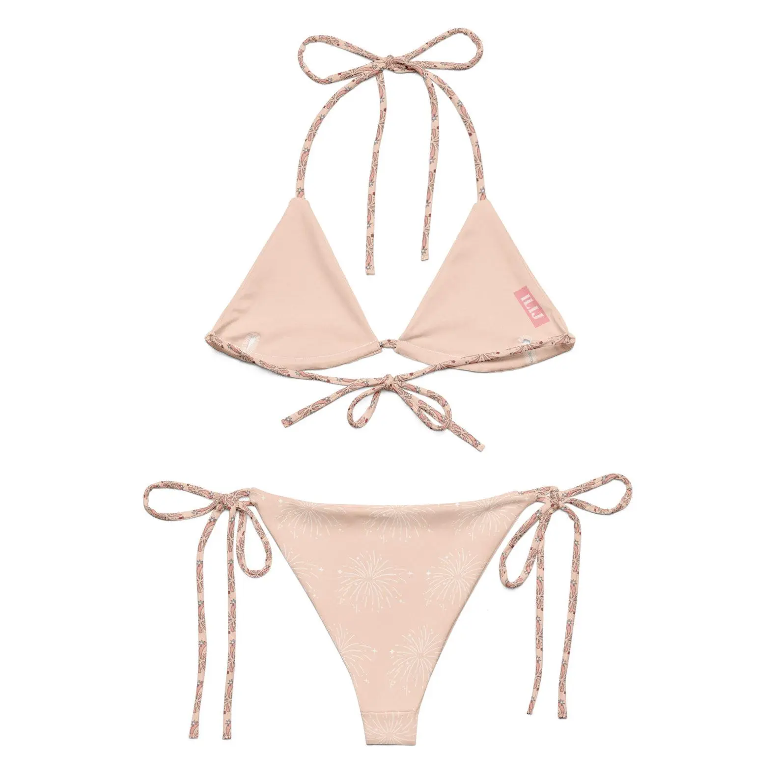 Simple and elegant, our unique custom bikini swimsuit includes 2 pieces – a string tie bikini bottom and a string bikini.