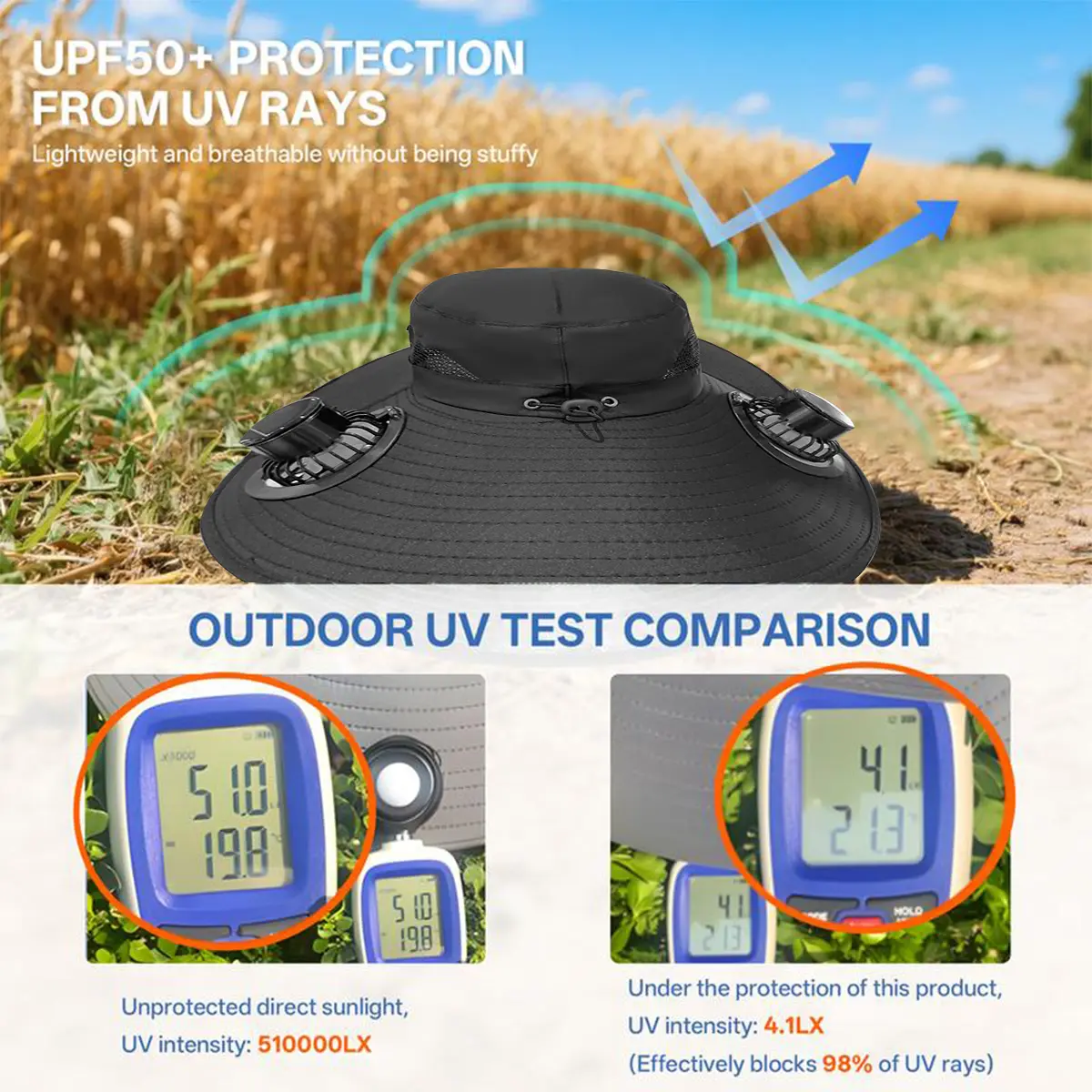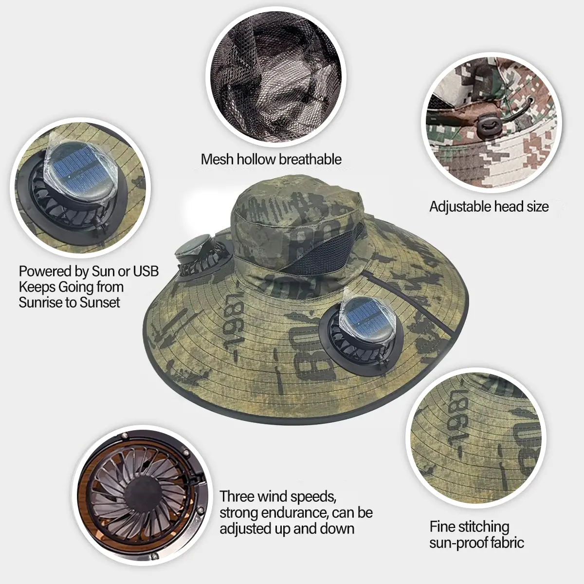 【Dual Power Mode】This men's fishing hat sun hat has two power supply modes: solar power supply or USB charging. You can choose the appropriate power supply mode according to the actual situation.