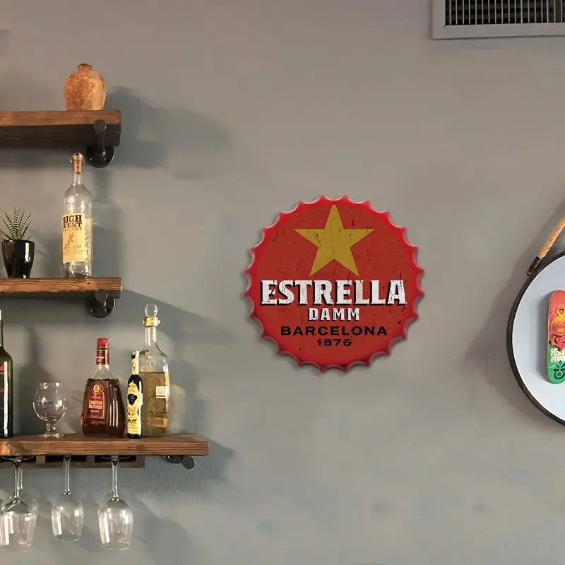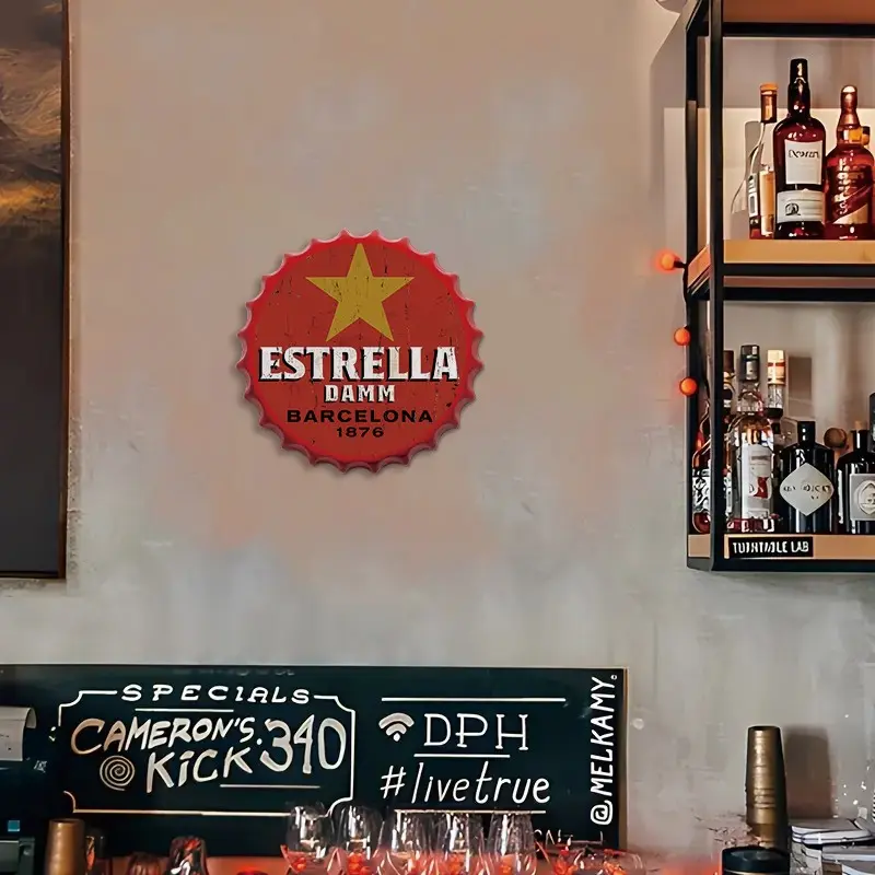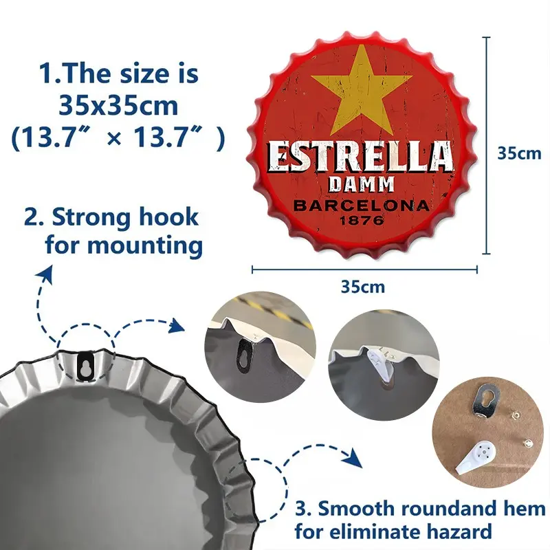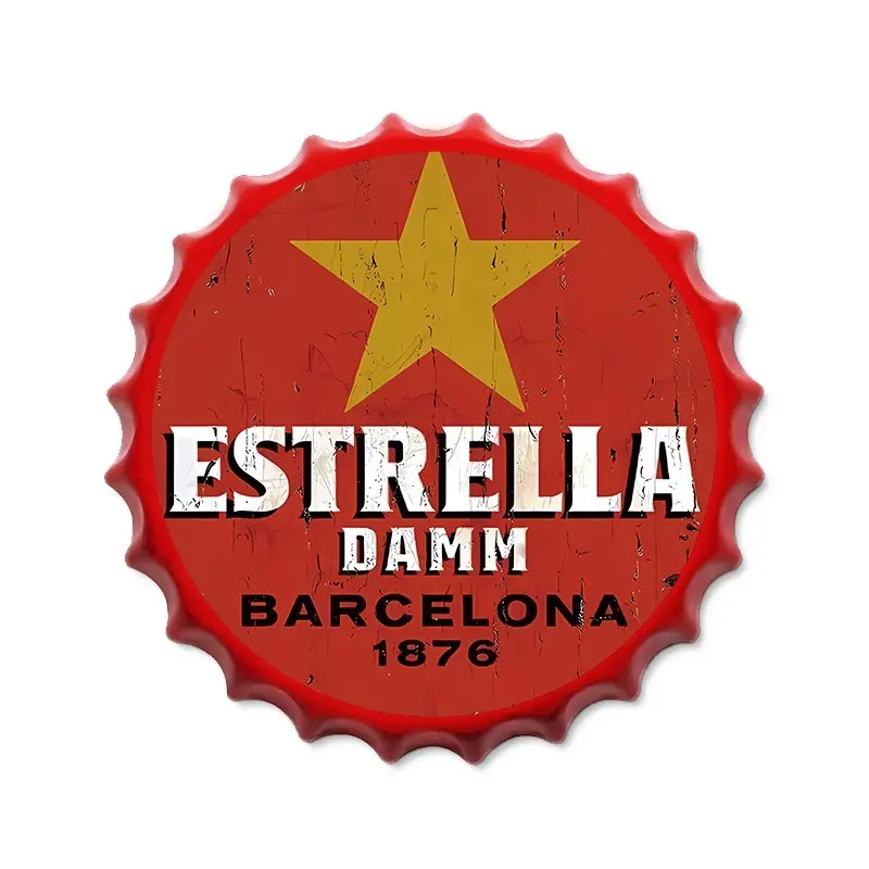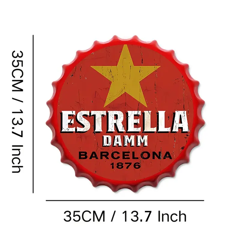 Vintage Beer Bottle Cap Metal Wall Art, 13.7 Inch Round Tin Sign with Frame, Ideal for Bar, Pub, or Café Decoration