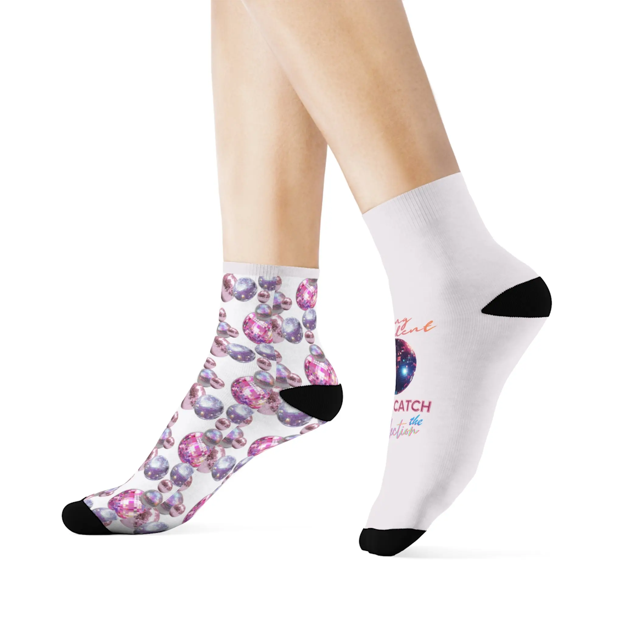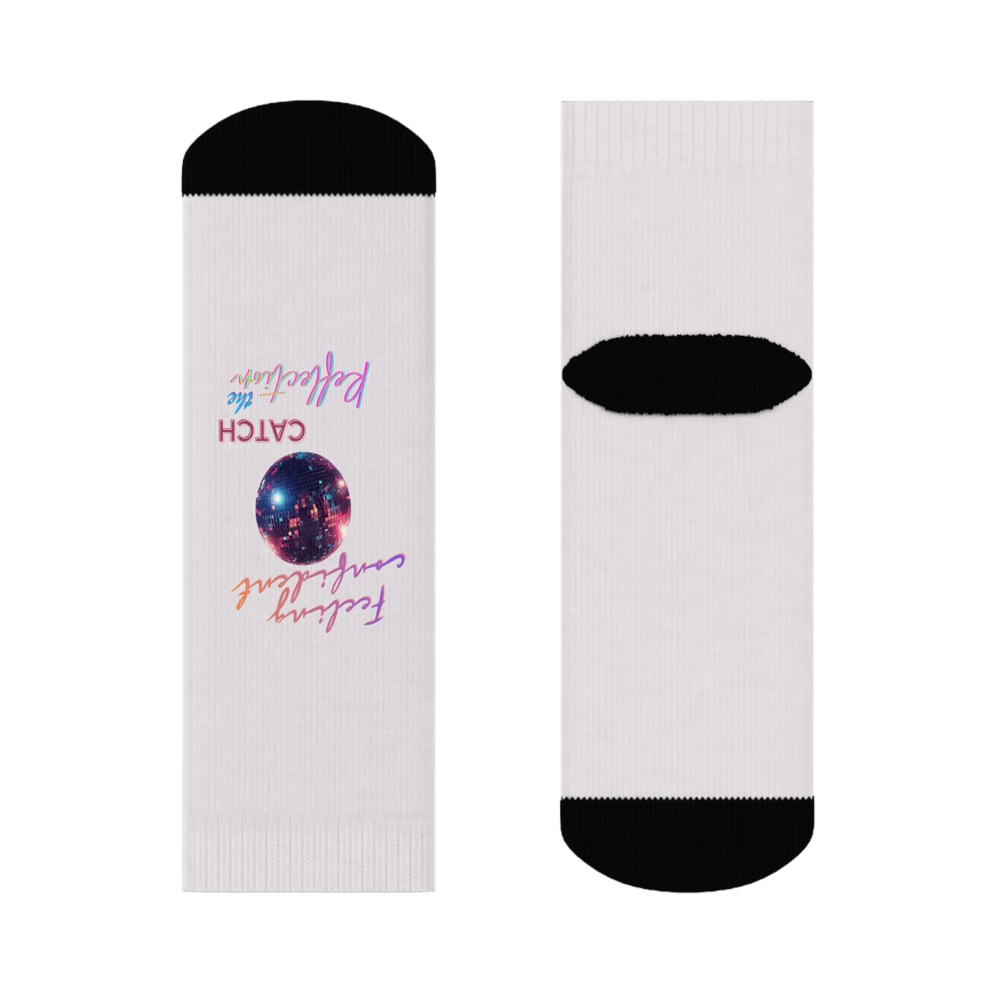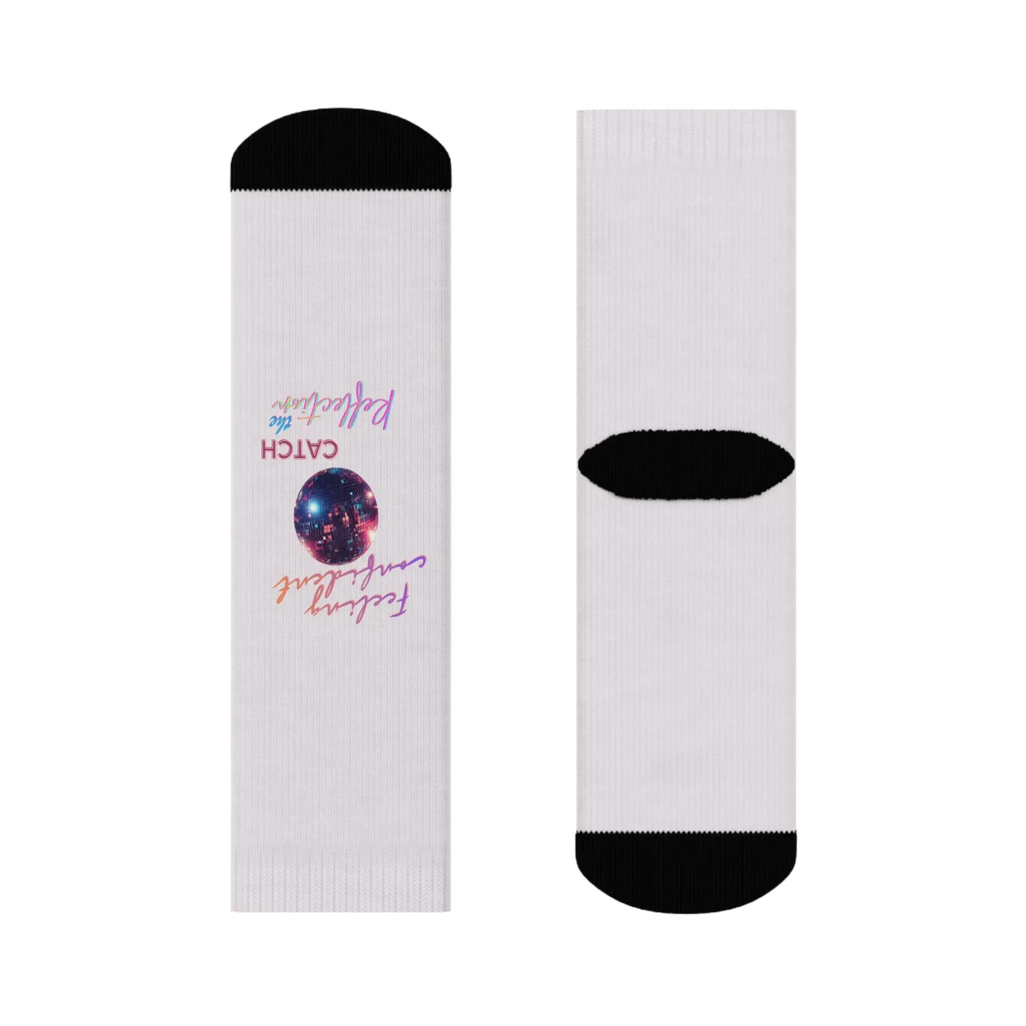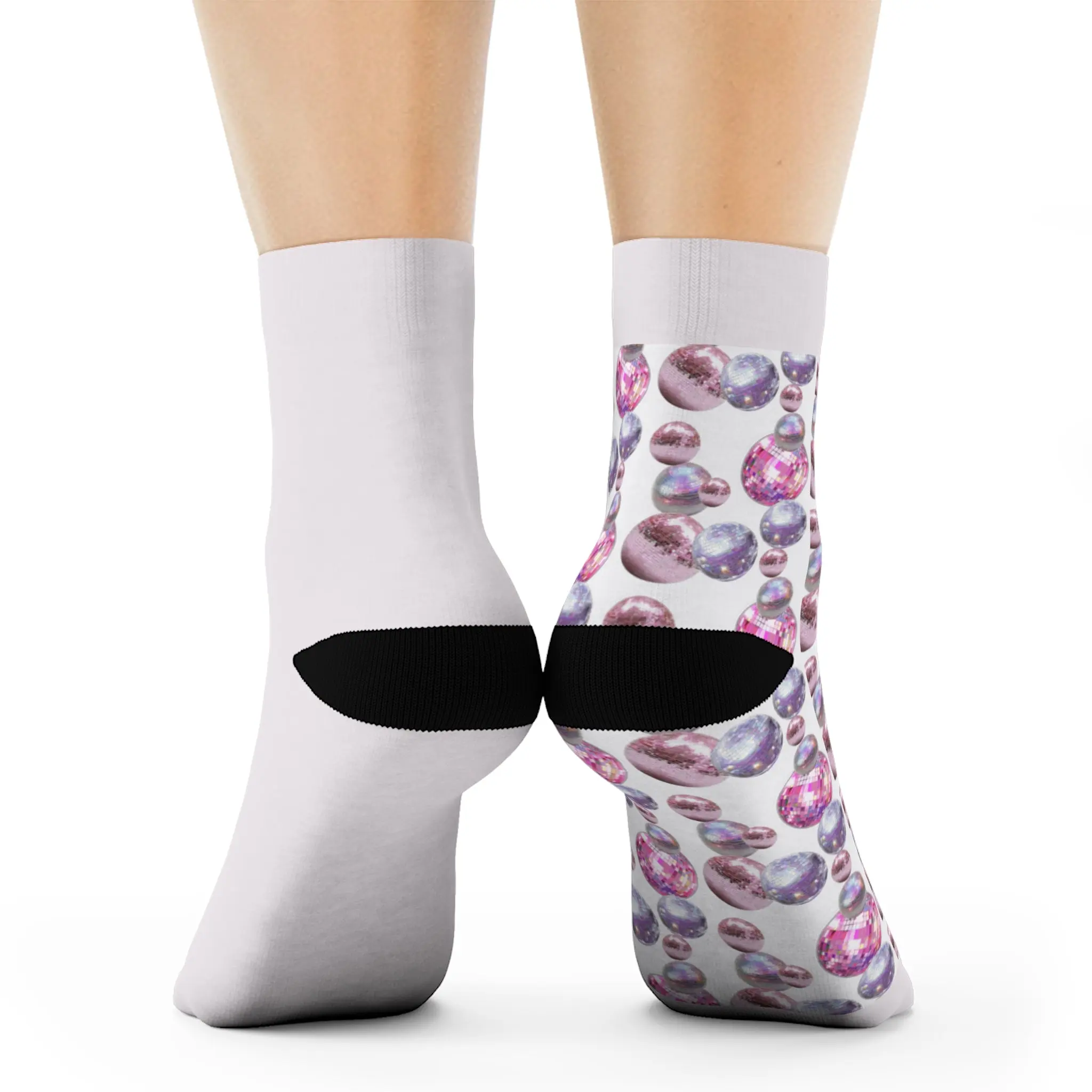 Slide into a pair of socks that feel like a little moment of wonder on your feet. These crew socks pair a crisp white base and black accents with all-over prints of pearlescent orbs and a small cosmic emblem—soft, playful, and quietly bold. The cushioned bottoms cradle your soles while the seamless toe and ribbed tube keep everything snug without pinching. They dry fast, hold their shape, and carry a subtle, dreamy vibe that suits slow mornings with coffee, late-night sketching, or layering under chunky boots for a touch of unexpected color.