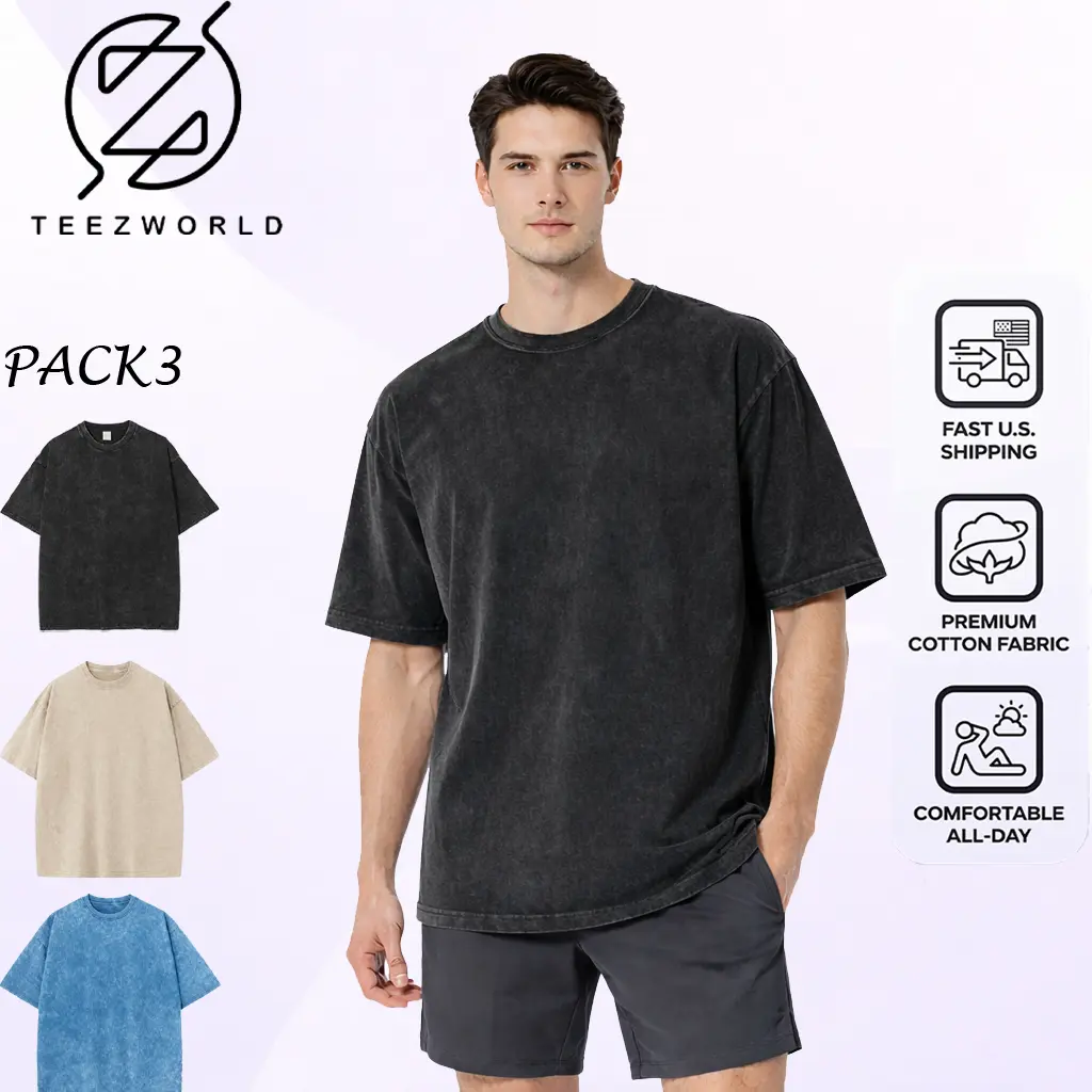 Premium 3-Pack Oversize T-Shirt Bundle, Vintage Wash Oversize Cotton Tee Relaxed Fit Streetwear Style Soft Breathable Fabric Comfortable All-Day Wear Durable Quality Basic Essential