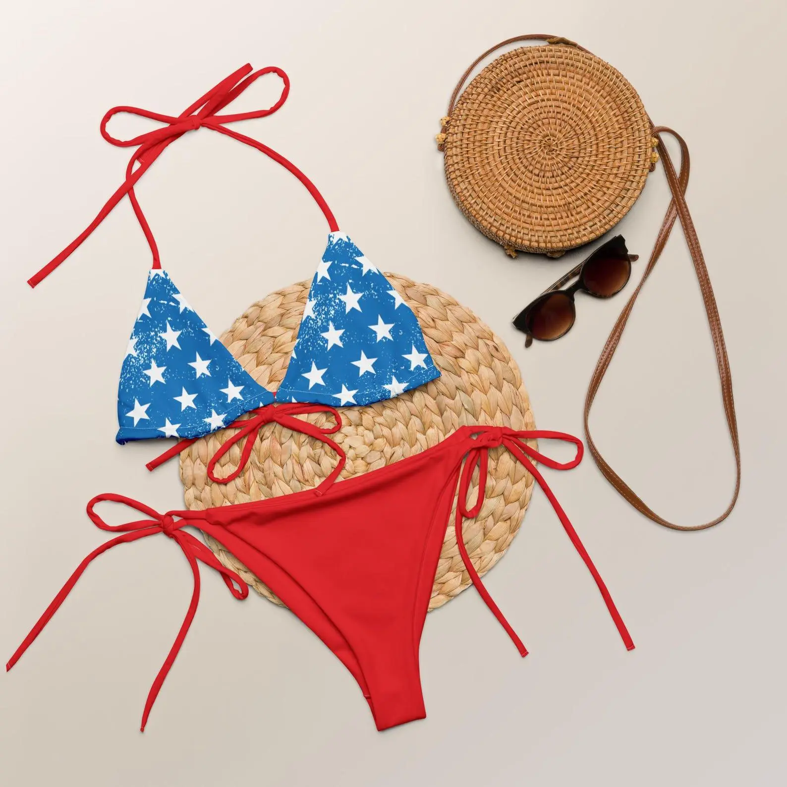 Simple and elegant, our unique custom bikini swimsuit includes 2 pieces – a string tie bikini bottom and a string bikini.