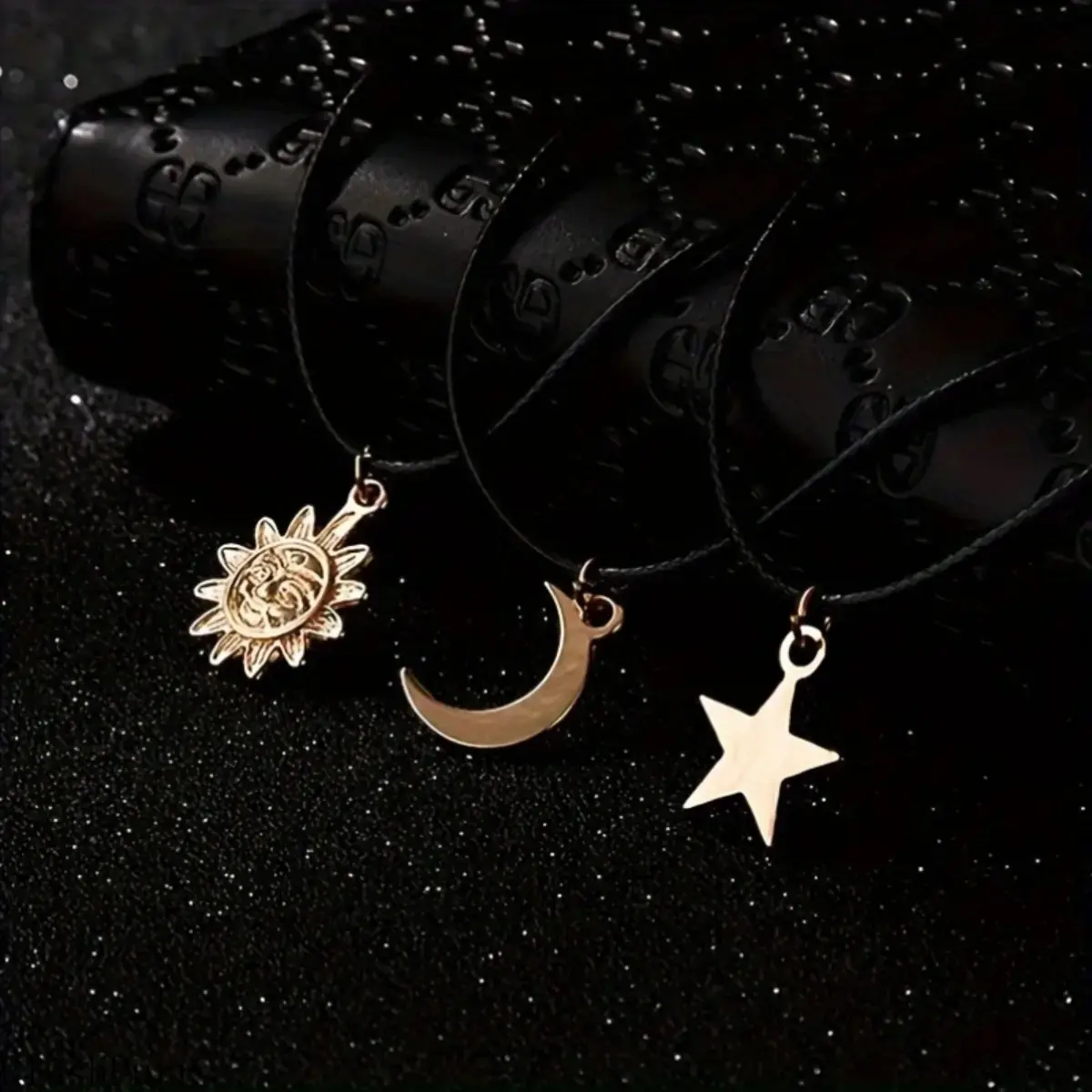 ·Celestial Layered Set: Includes three distinct necklaces—featuring sun, moon, and star pendants—designed to be worn together for a curated, on-trend look.