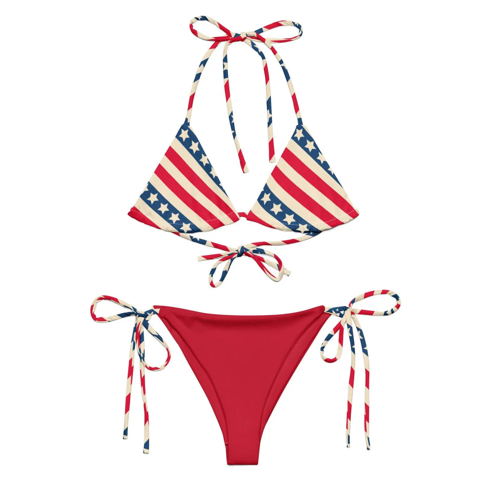 Simple and elegant, our unique custom bikini swimsuit includes 2 pieces – a string tie bikini bottom and a string bikini.