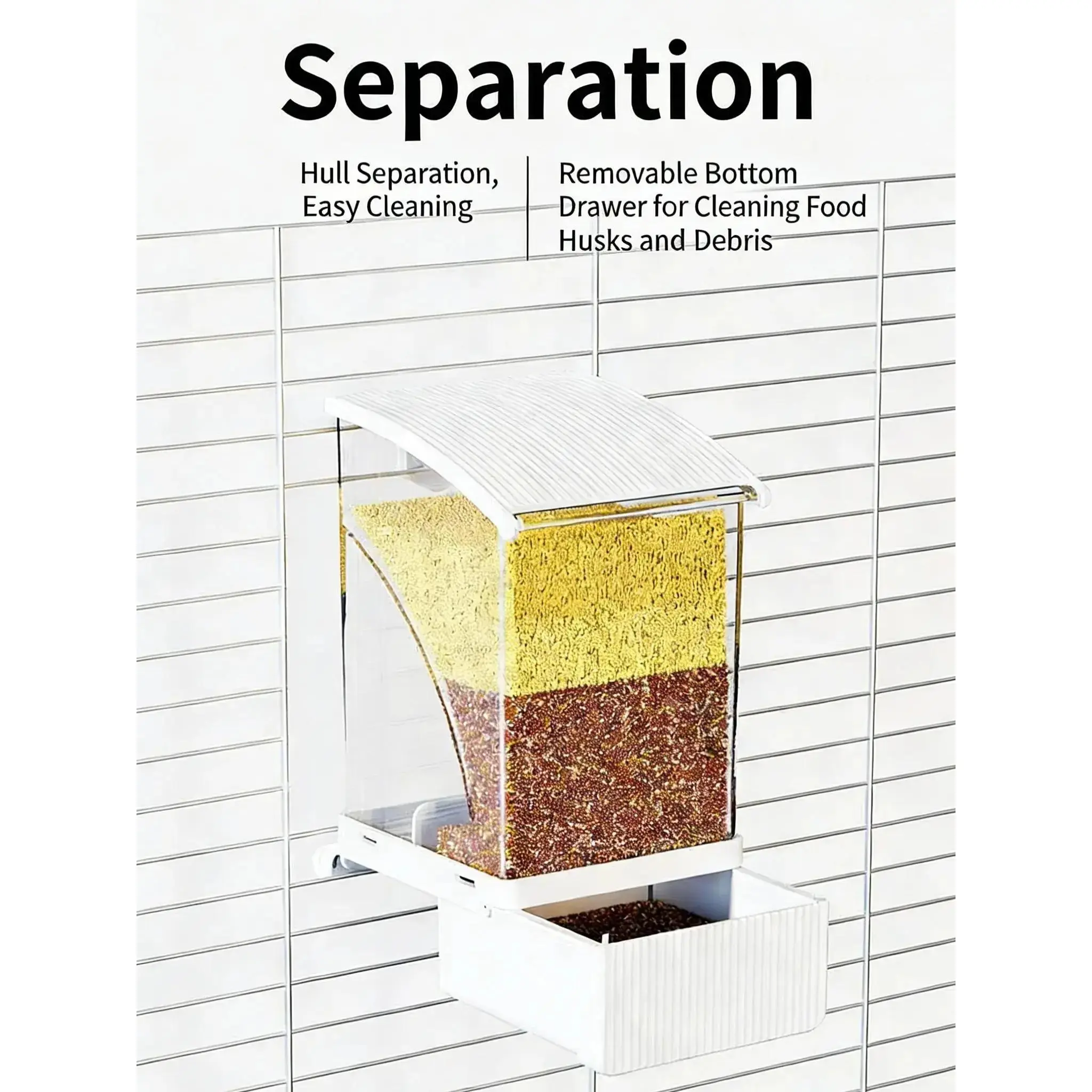 1.Exclusive "Zero Waste" No-Mess Design.The unique double-layer structure design ensures that when birds are eating, the leftover husks automatically fall into the detachable small drawer at the bottom instead of splattering outside the cage.