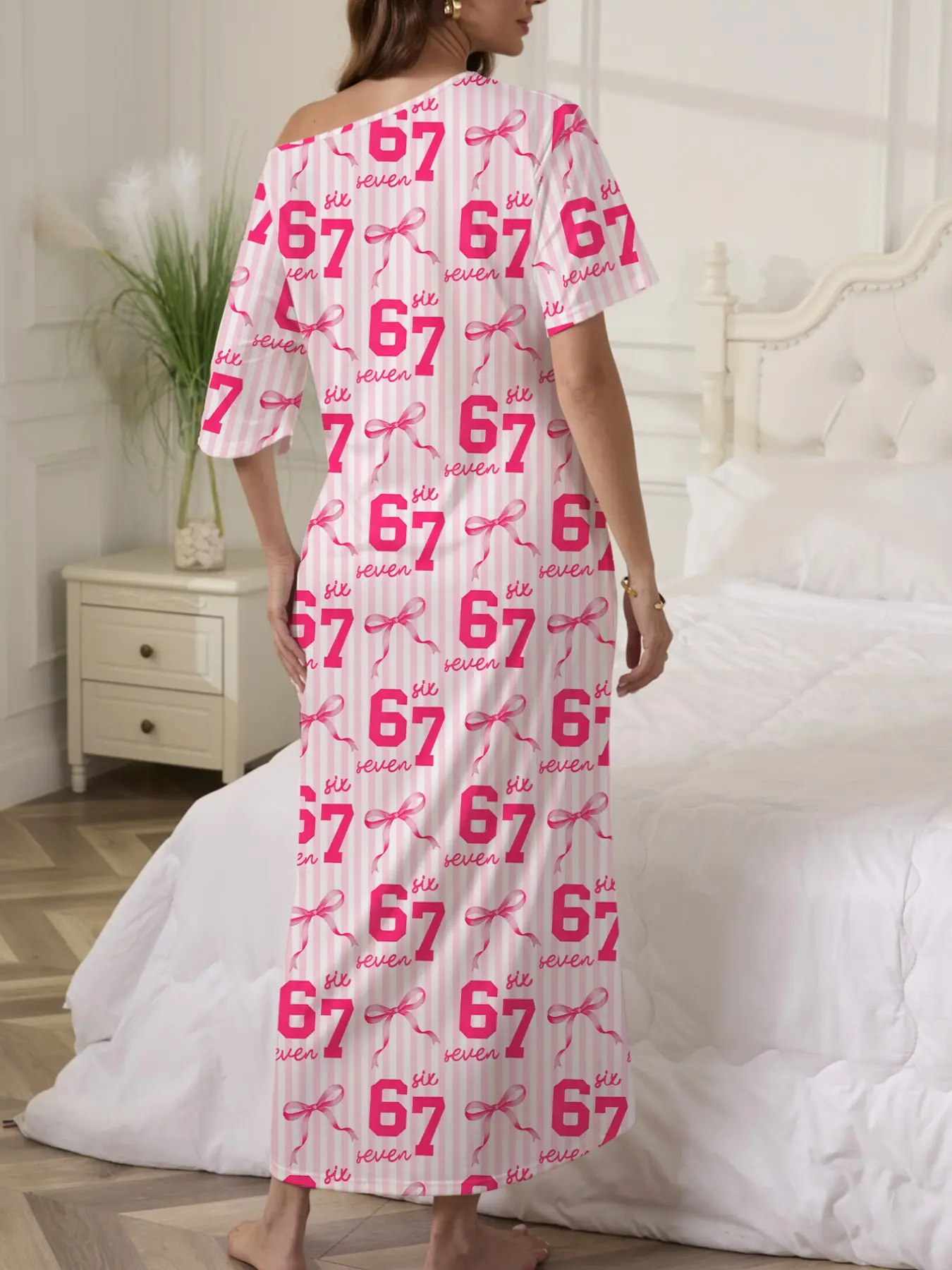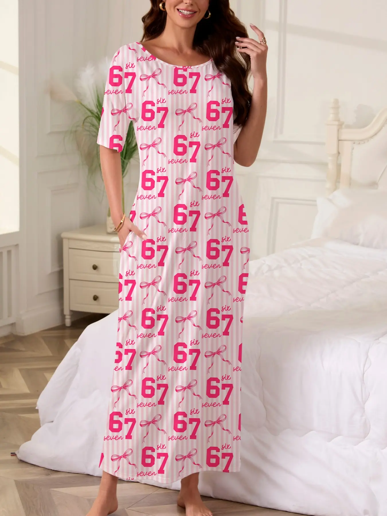 5. Butterfly Number Print Nightgown, Women's Casual Loose-Fit Short Sleeve Robe, Comfortable Holiday Party Sleepwear, Side Pockets, All Seasons