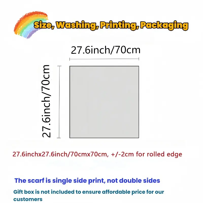 The scarf is single-sided printed; it is not double-sided. A gift box is not included to ensure an affordable price for customers.