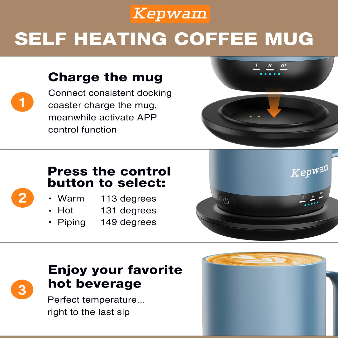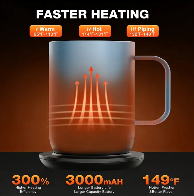 ·Perfect Temperature Every Time: Kepwam Mug lets you choose your perfect setting (113°F, 131°F, or 149°F) with up to 4.7 hours of wireless warmth. Use the charging coaster for all-day warmth.