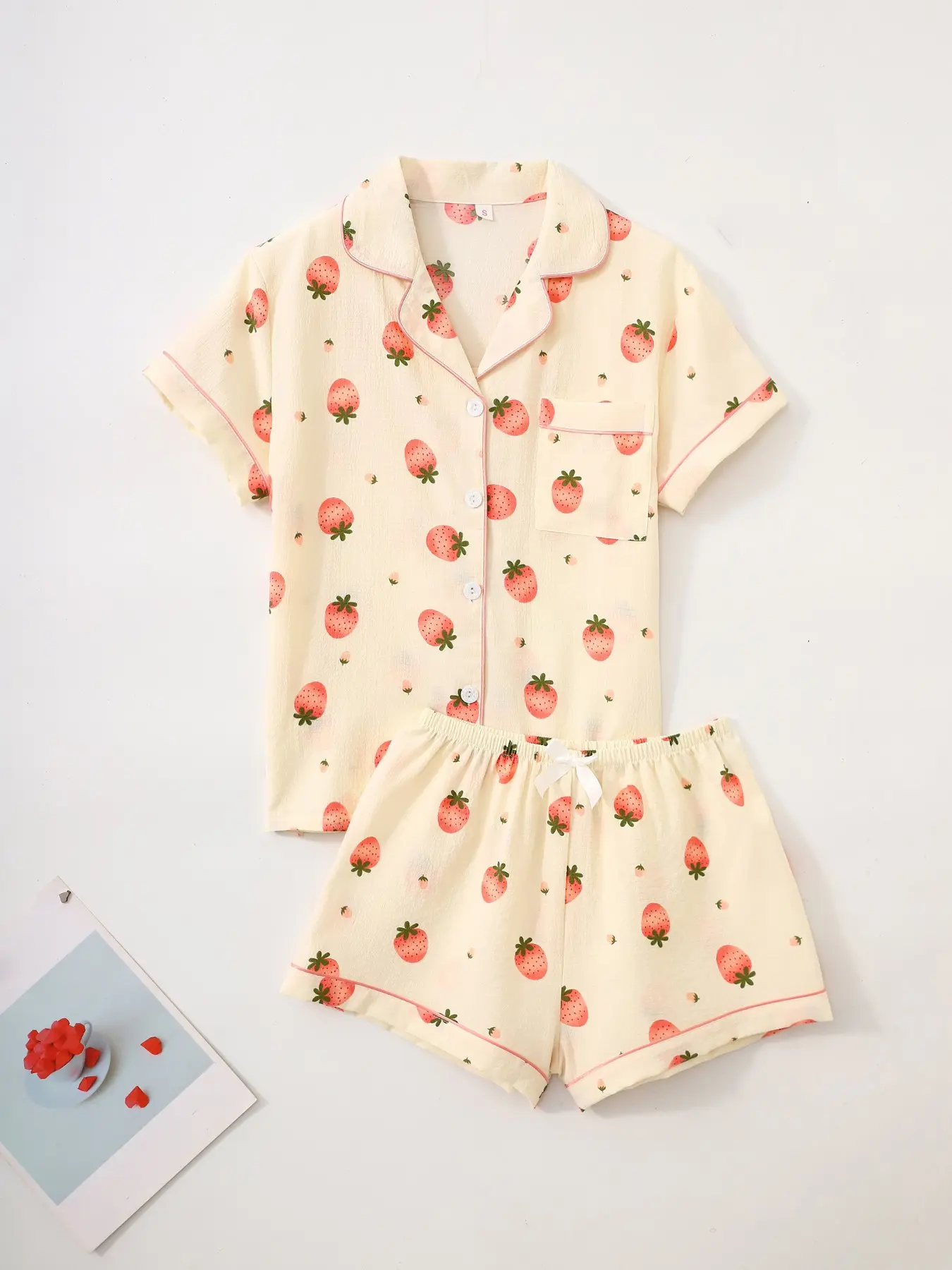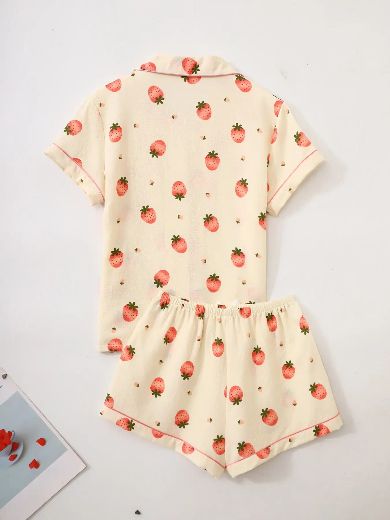 Women's Short Sleeve Button Down Top and Shorts Pajama Set, Spring Summer Wear, For Cute Sweet Girls, Cream Base Pink Strawberry Print, Classic Lapel Collar, Loose Vitality Fit, Comfortable For Home & Gatherings