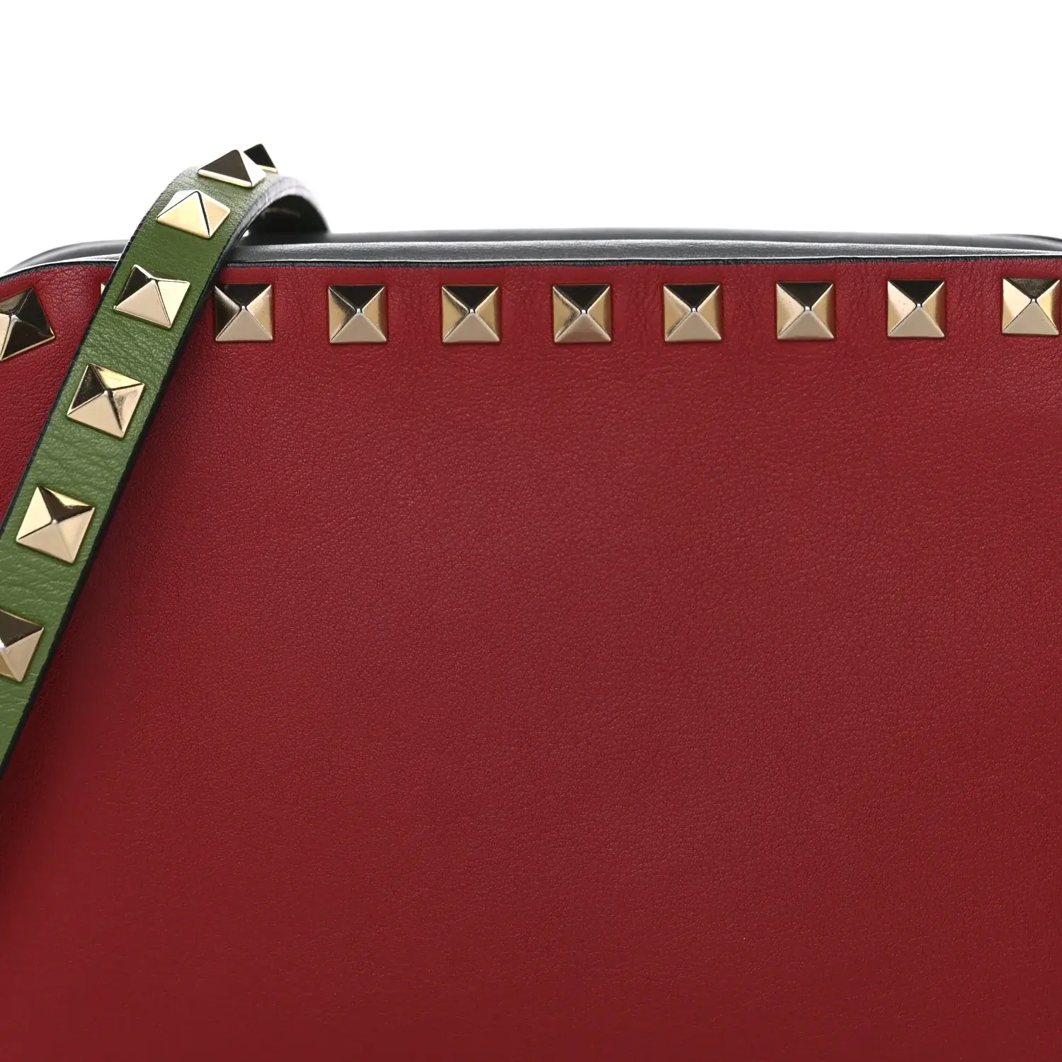 This is an authentic VALENTINO GARAVANI Calfskin Colorblock Rockstud Camera Crossbody Bag in Deep Rose and Clover. This ultra-chic cross-body shoulder bag is crafted of luxurious calfskin leather in a color-block style of several shades. This statement cross-body bag is bordered with signature gold pyramid studs along the borders of the bag including the shoulder strap. The top zipper opens to a beige fabric interior with a patch pocket.