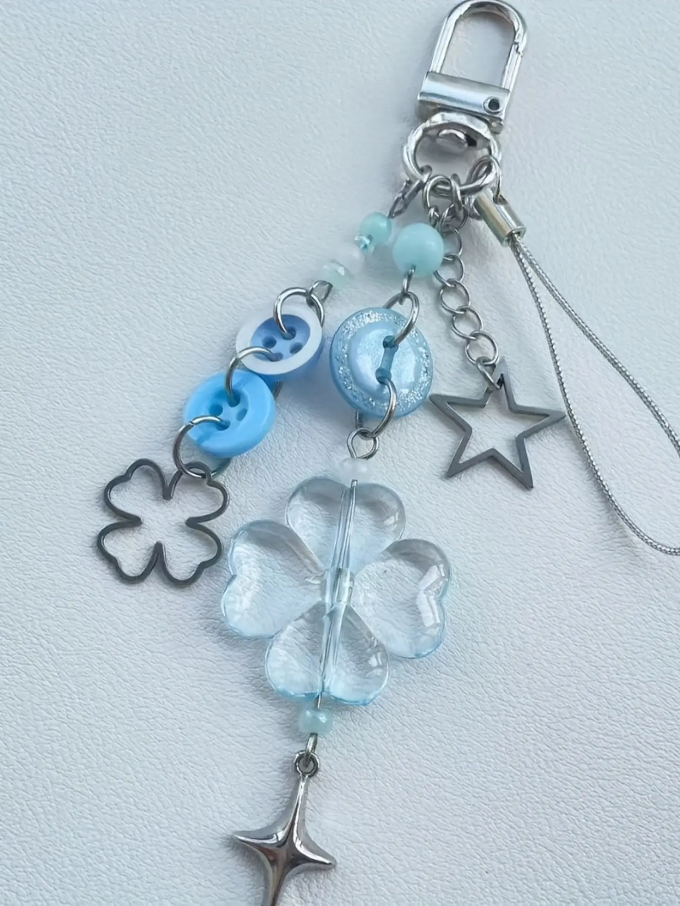 5. Lucky Clover Beaded Phone Strap, Handmade Transparent Flower Leaf Star Keychain, Soft Tone Design, Fashion Accessory, Fantasy Jewelry