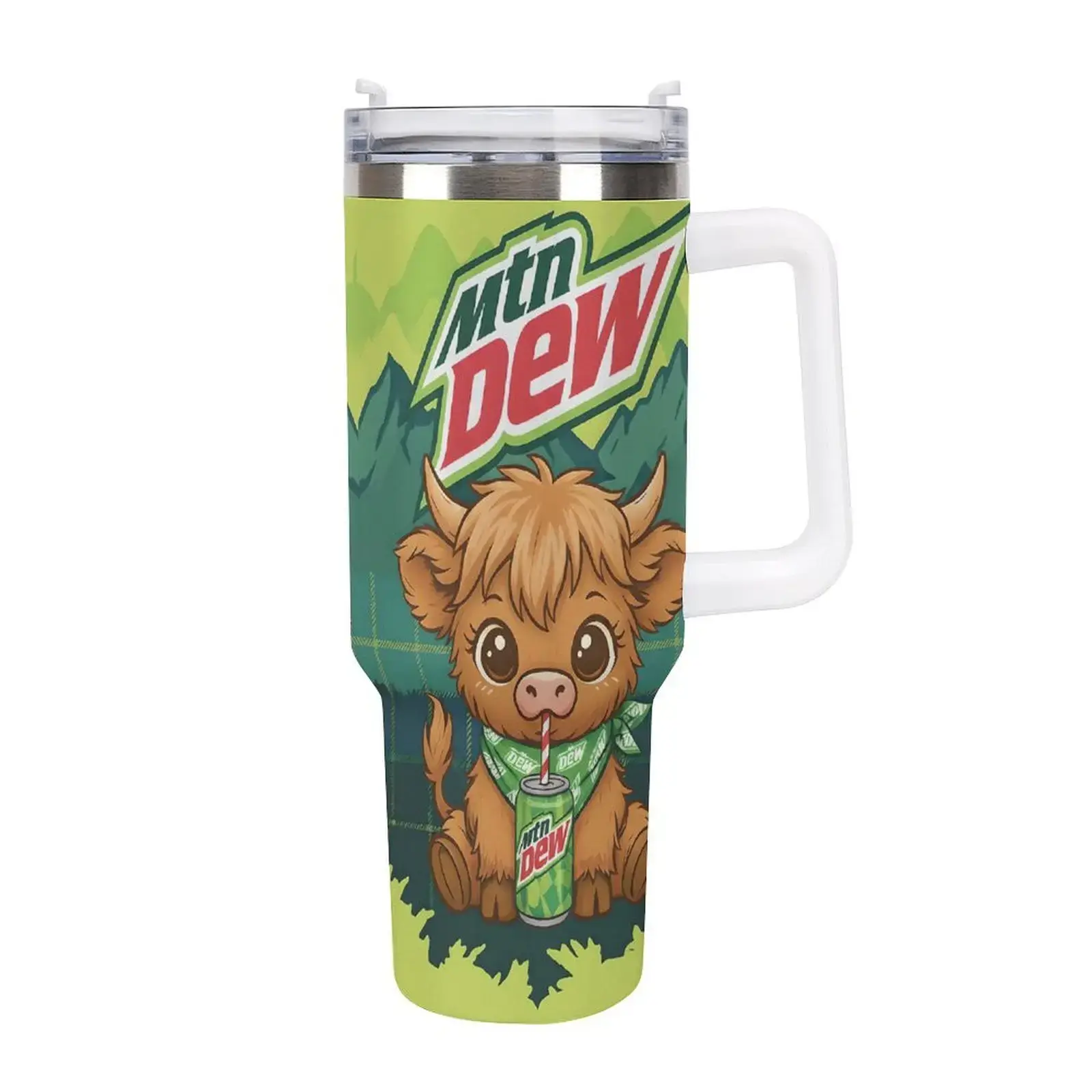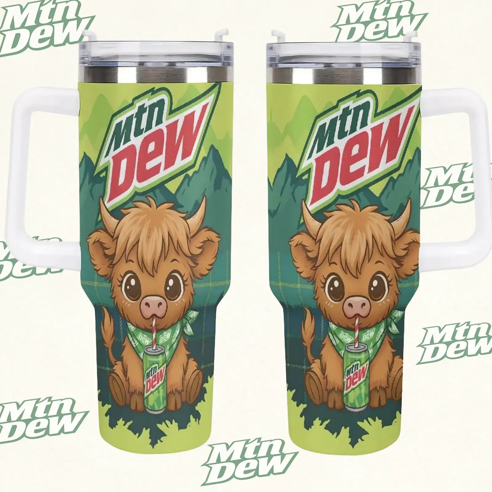 [Made in US] Mtn Dew Highland Cow Tumbler - 40oz Travel Mug with Handle and Straw - Cute Baby Cow Graphics, Mountain Landscape Design, Dew the Moo Adorable Highland Cow Mtn Dew Aesthetic 40oz Travel Cup