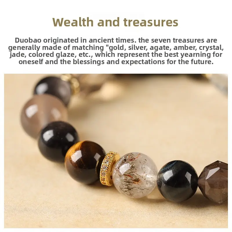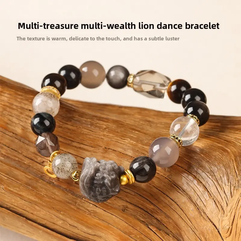 [Wealth Abundance] crystal bracelet, silver obsidian grey agate smoky quartz super seven tiger eye white crystal, unisex, daily wear gift, 10mm beads, natural stone lion ornament gold accents, wealth blessing abundance symbol