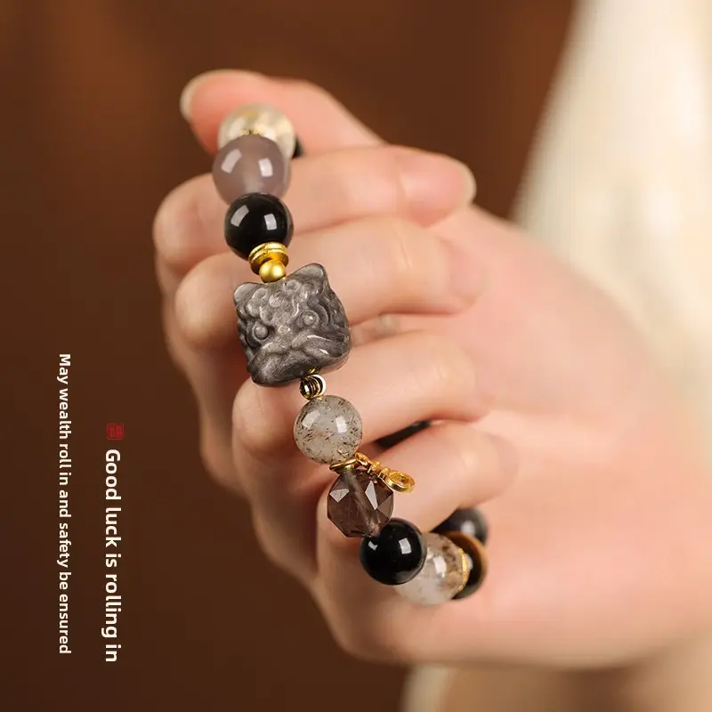 [Wealth Blessing] crystal bracelet, silver obsidian Tibetan silver sand gold, unisex, daily wear gift, 10mm beads natural stone, wealth blessing symbol