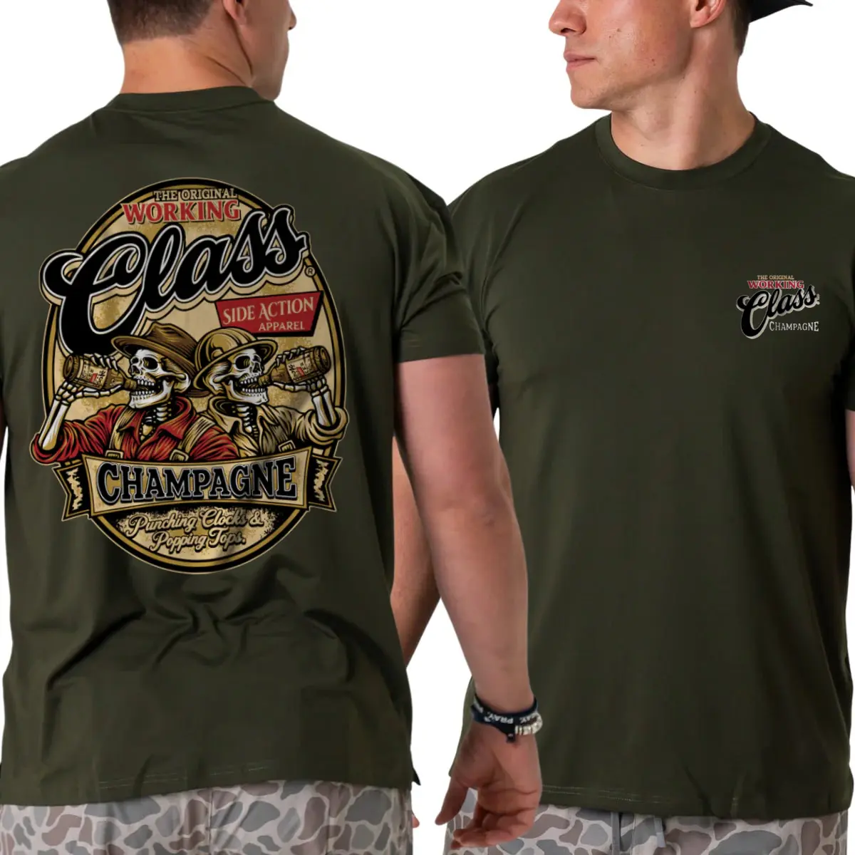 This skull drinking tee mixes blue collar humor with a fun “champagne lifestyle” twist.