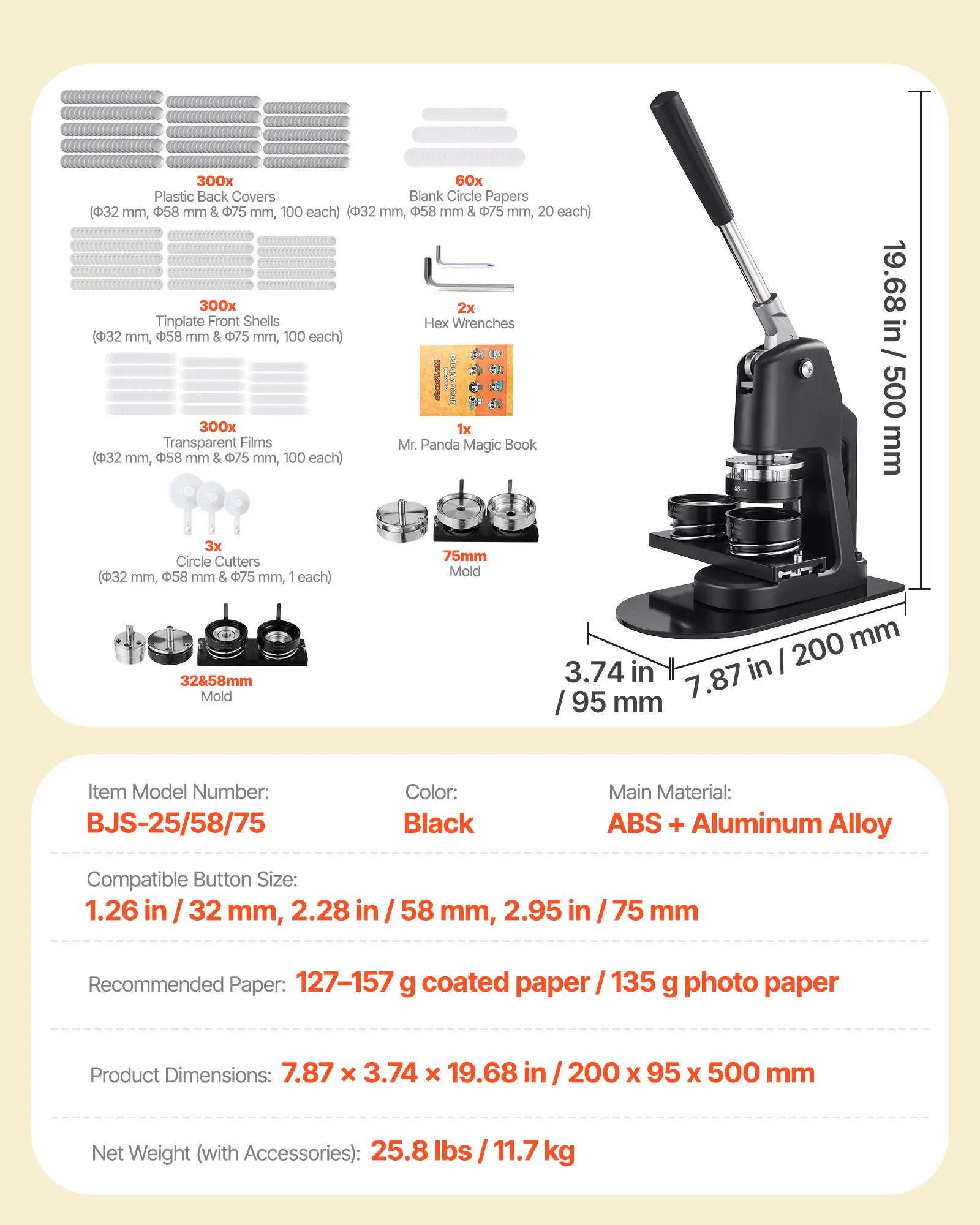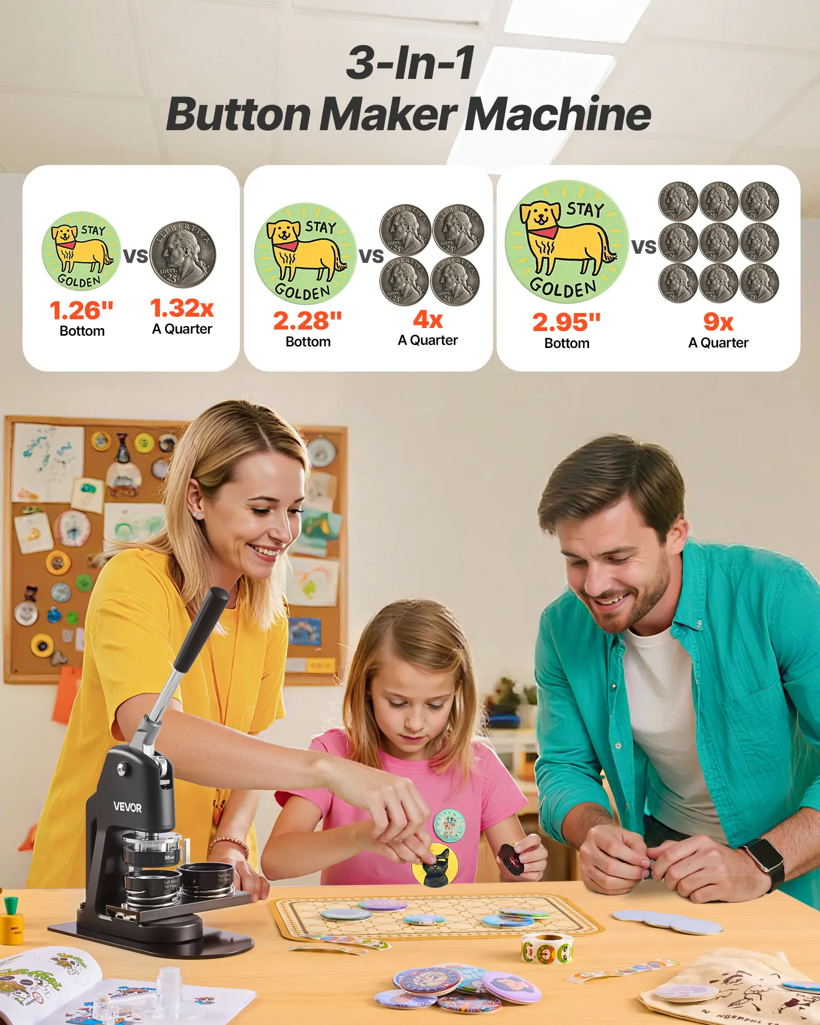 3-in-1 Design: Our button maker machine includes 1.26/2.28/2.95 inch button parts. You can create badges in different sizes, solving the issue of size mismatch when changing materials, providing a better user experience and creative flexibility
