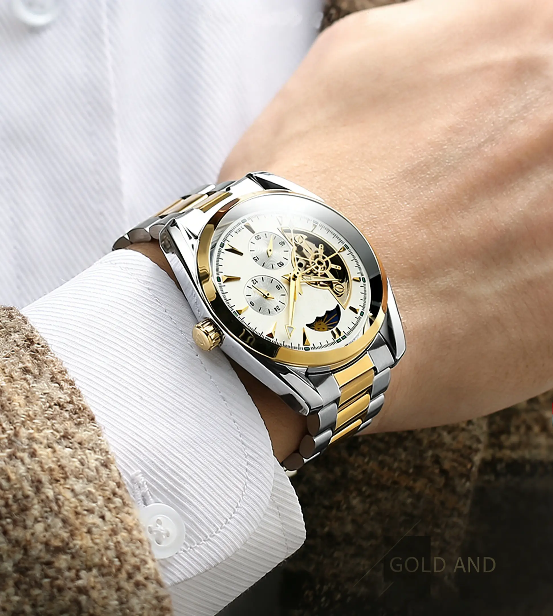 Functional Moon Phase Display: Features a sun/moon phase window, combining practical timekeeping with elegant astronomical design, perfect for watch enthusiasts and style lovers.