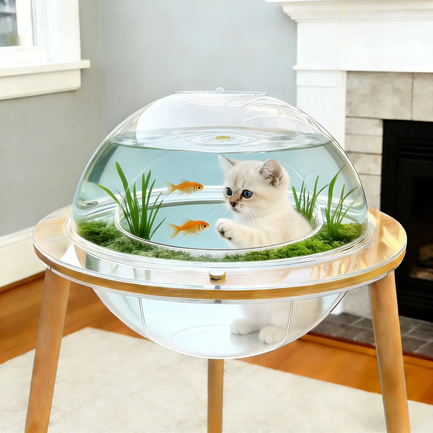 Eyisean 23.6" Acrylic Large Round Transparent Cat Cave, 2-in-1 Space-Saving Kitty Bed Fish Tank with Plywood Base, Heavy-Duty 360° Immersive Pet House, Indoor Cat Enrichment Furniture for Living Room