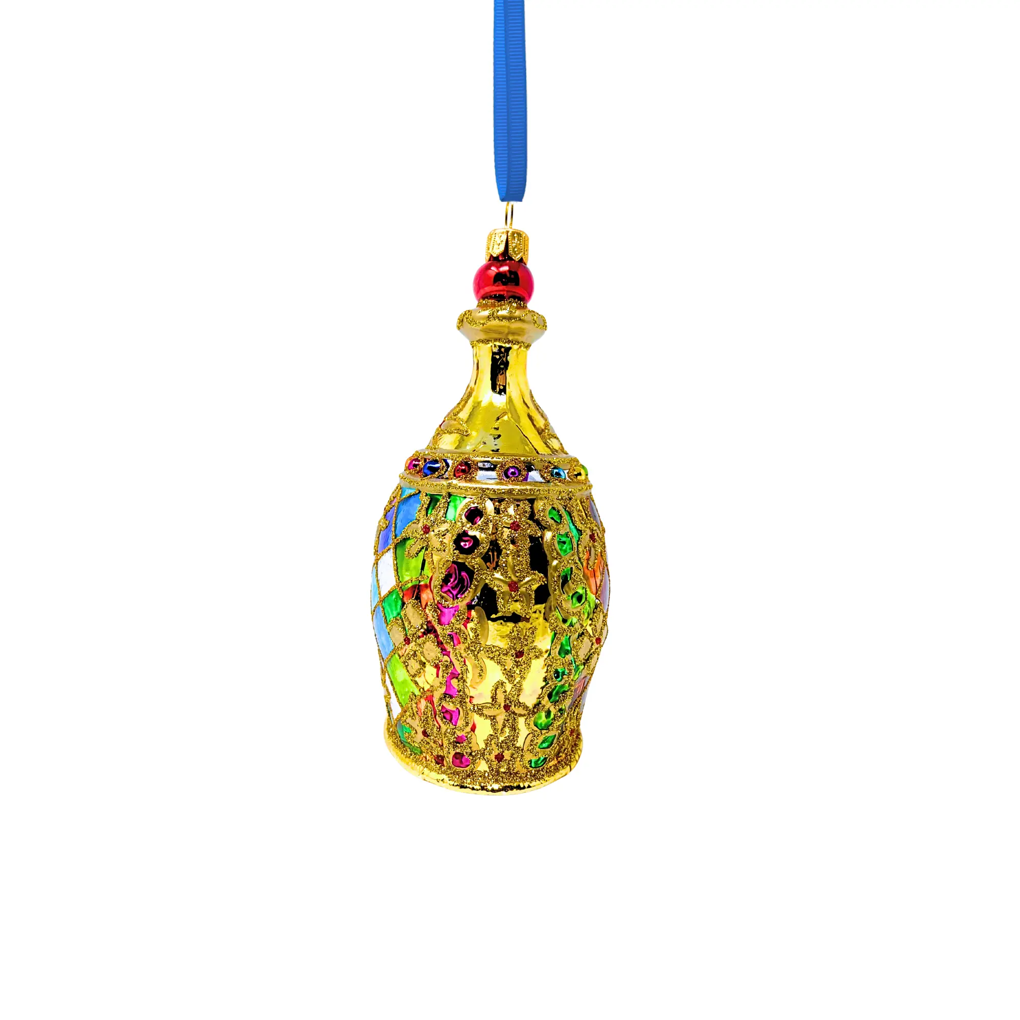 A bottle-shaped silhouette wrapped in harlequin glass panels and gilded latticework, finished with jewel tones that glow from every angle. It feels like something lifted from a velvet-lined bar cart, theatrical and rich with detail. A splash of color. A dash of drama. Always ready to be noticed.