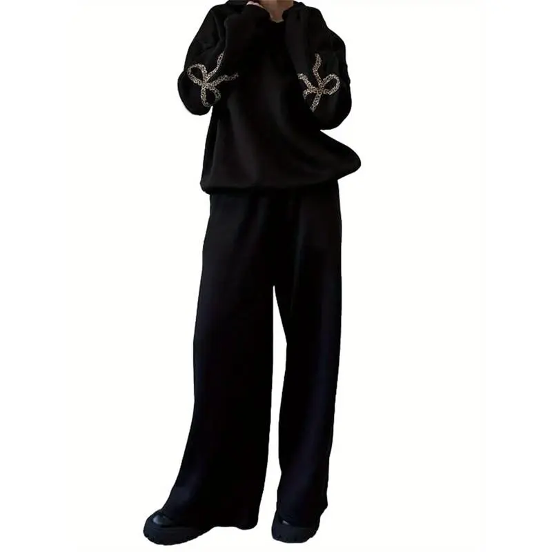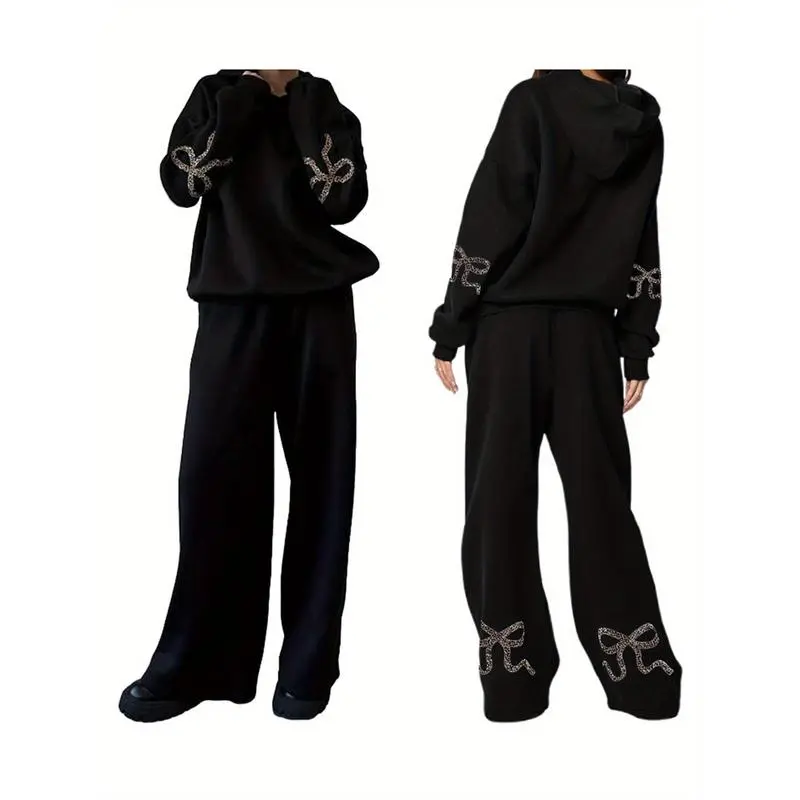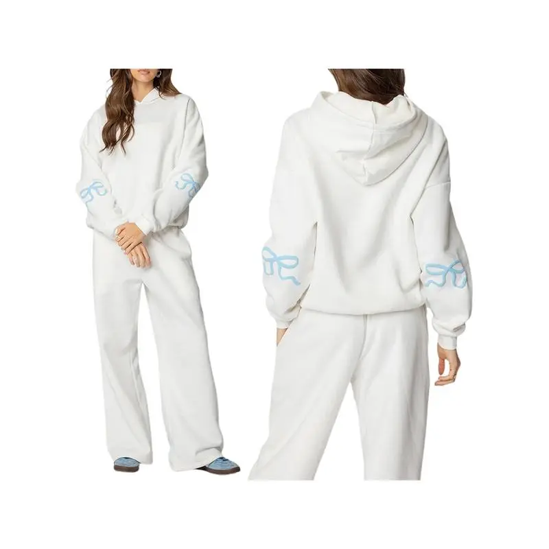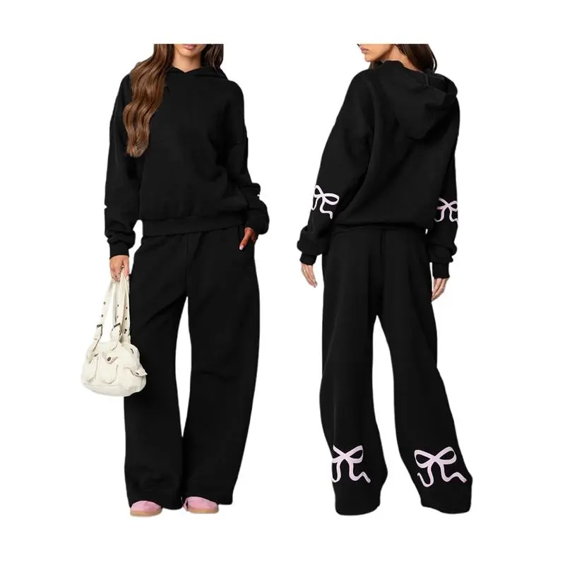 5. Women'S 2pcs Casual Outfits Long Sleeve Bow Print Hooded Tops Wide Leg Pants Sets Clothes Suits Womenswear Fabric Woven Gamis Baggy Loose Oversize