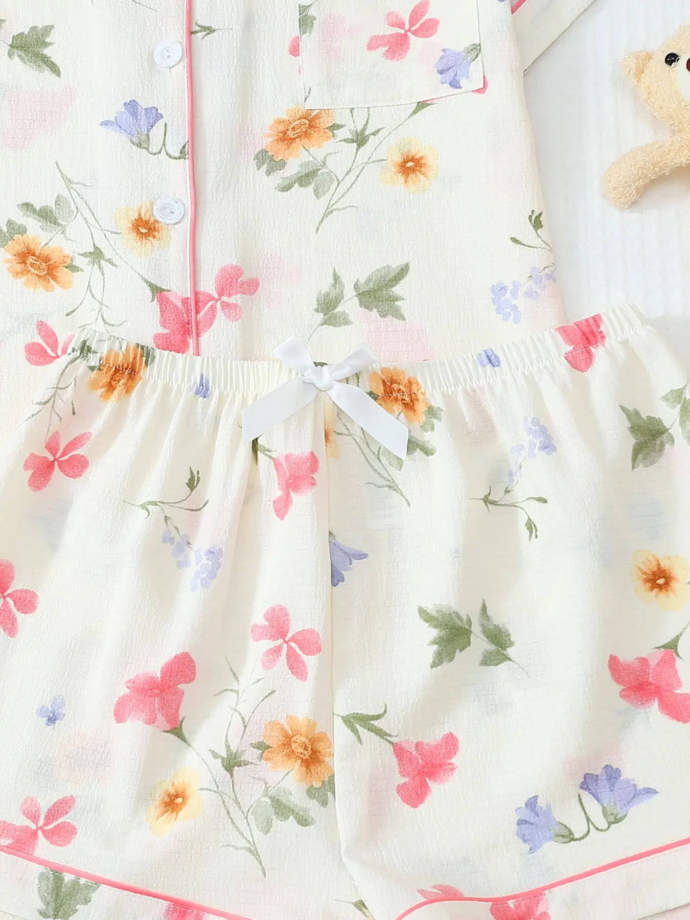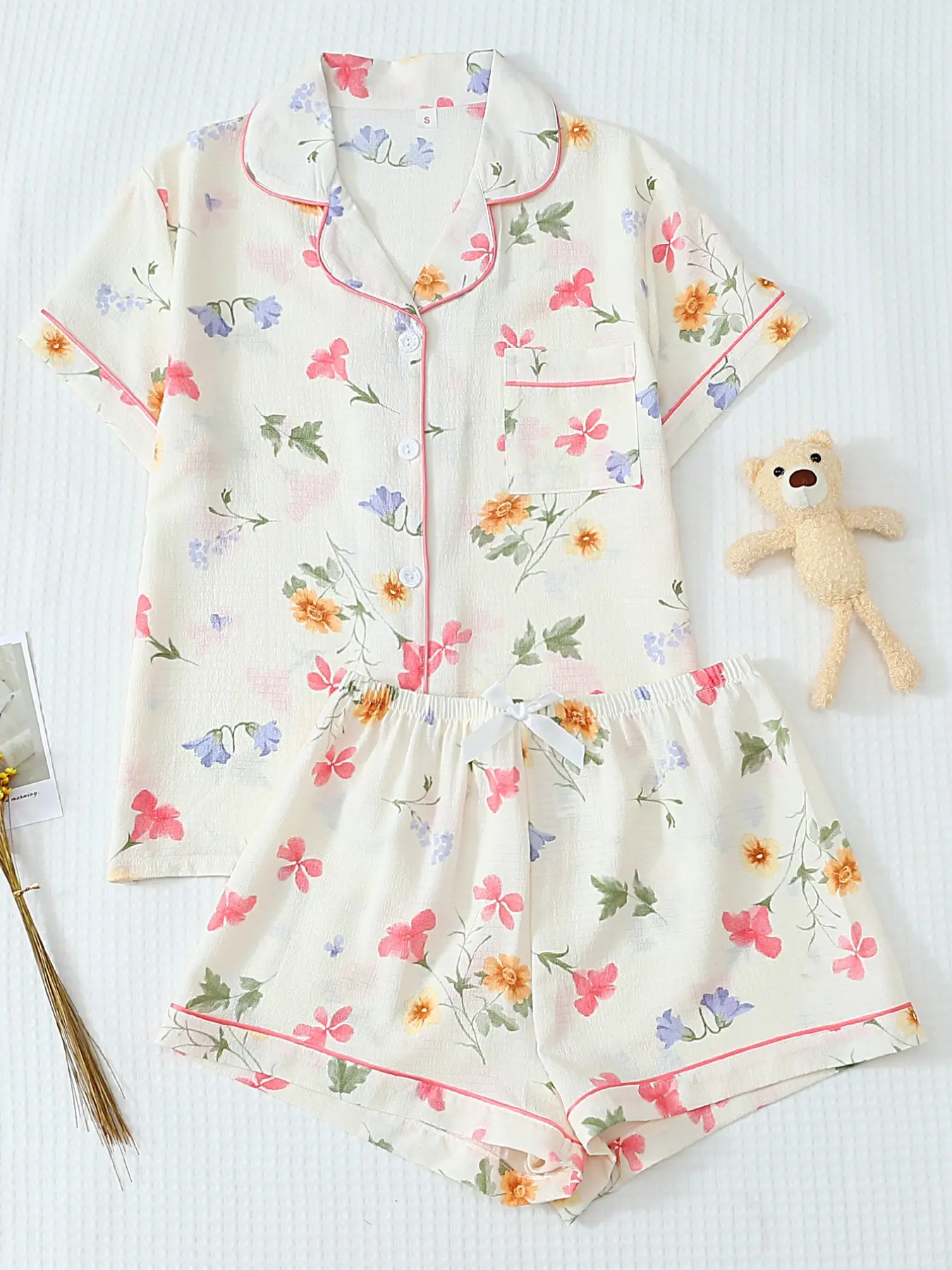 Women's Short Sleeve Button Down Top and Shorts Pajama Set, Spring Summer Wear, For Forest Style Literary Girls, Cream Base Natural Ditsy Floral Print, Classic Lapel Collar, Loose Fit, Comfortable For Home & Short Trips