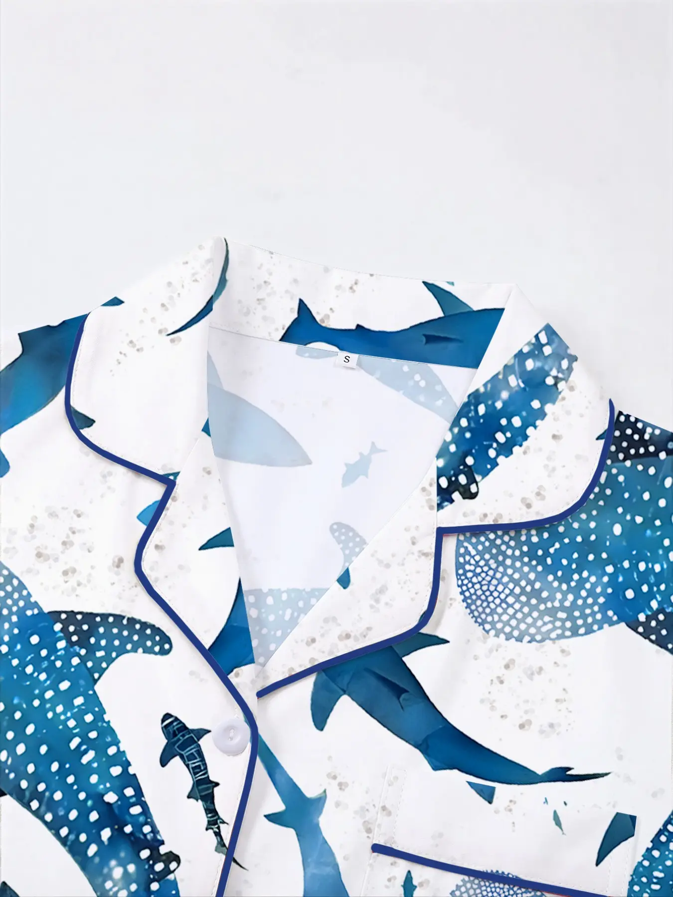 Women's Shark Print Pajama Set, Short Sleeve Button-Up Top and Elastic Shorts, Casual All-Season Sleepwear, Comfortable Home