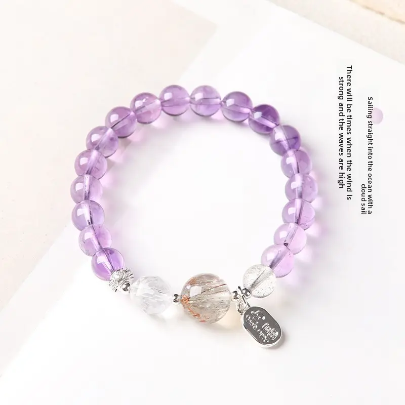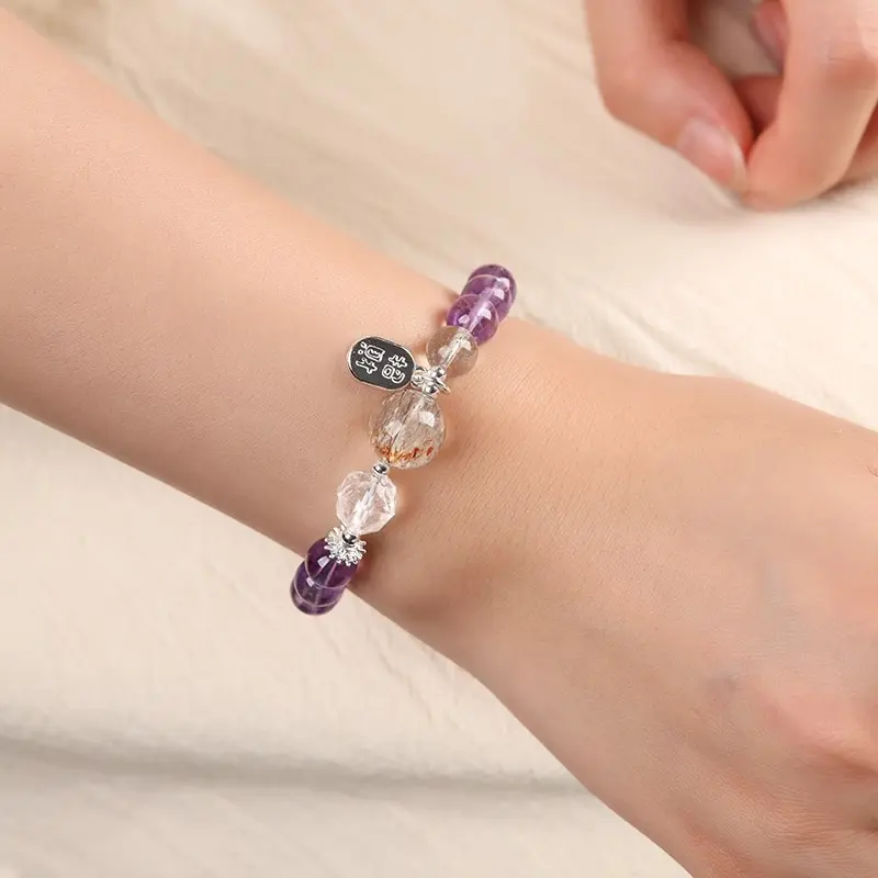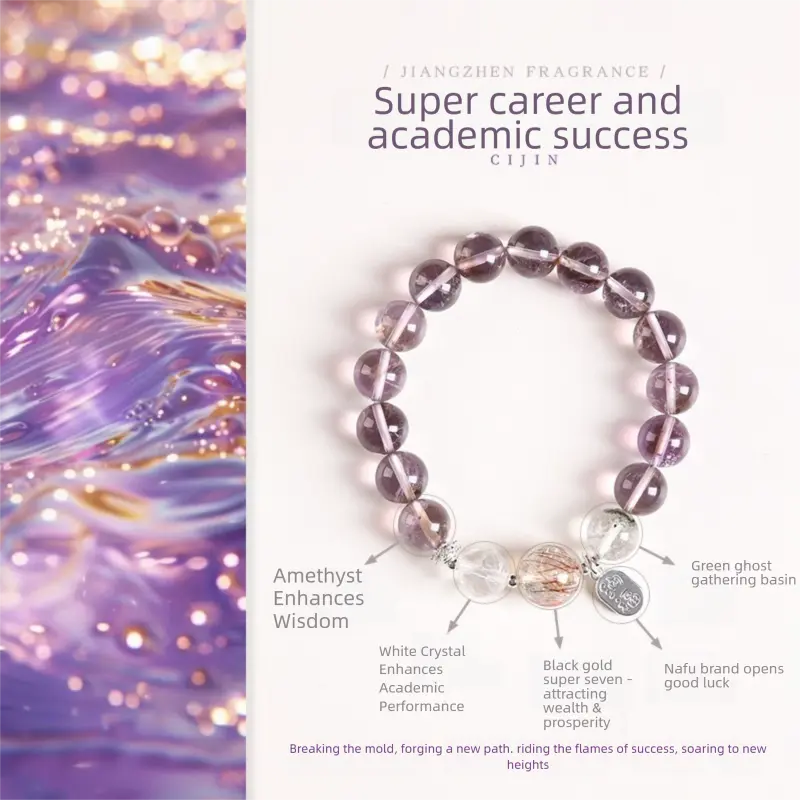 [Wisdom Success] crystal bracelet, amethyst white crystal black gold super seven green phantom, unisex, daily wear gift, 10mm beads natural stone silver accents, wisdom success courage symbol
