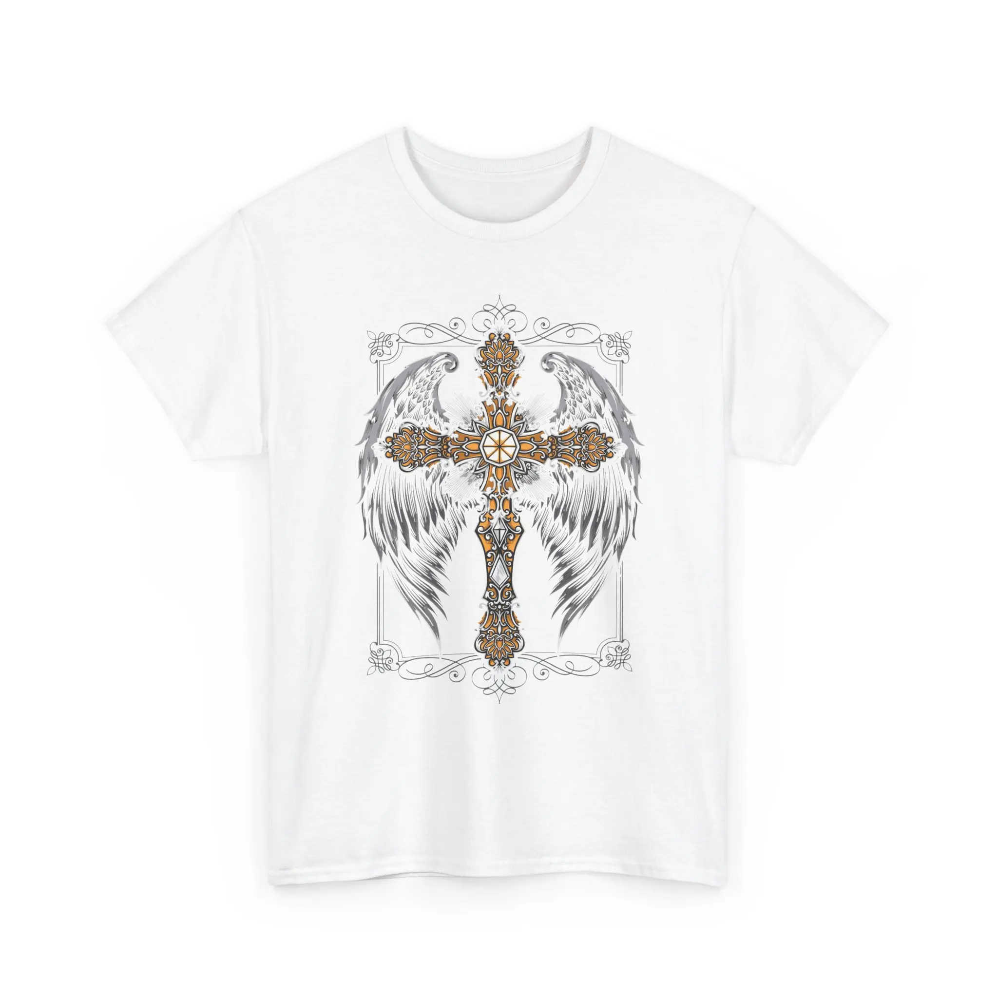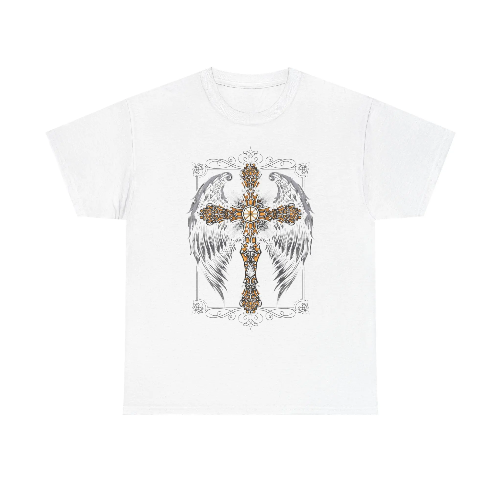 Soft, breathable cotton meets devotional artwork. This classic tee carries a finely detailed cross set against feathered angel wings — an artful balance of reverence and edge. Light and airy on warm days, it layers cleanly under jackets or stands alone with jeans. The print’s delicate shading and metallic accents keep the design feeling handcrafted and personal, like a talisman you reach for when you want to feel steady and seen.