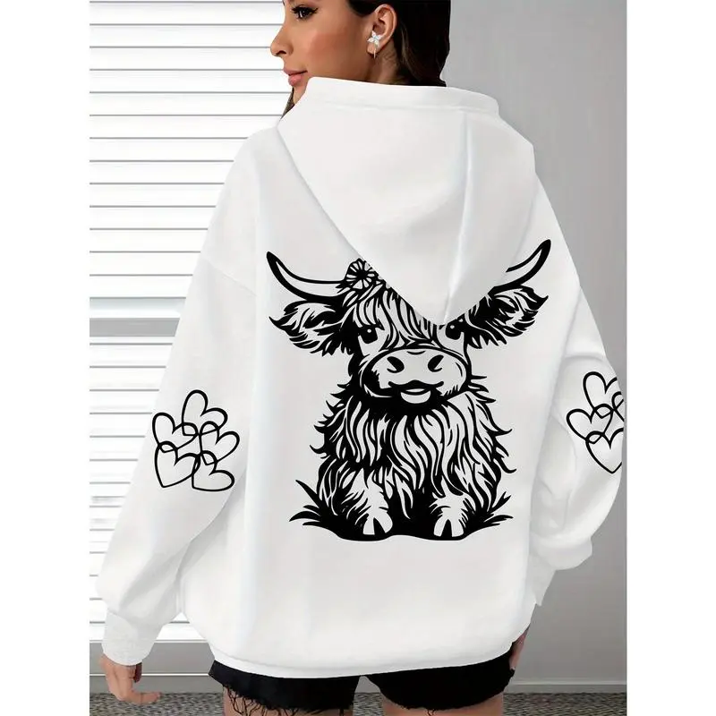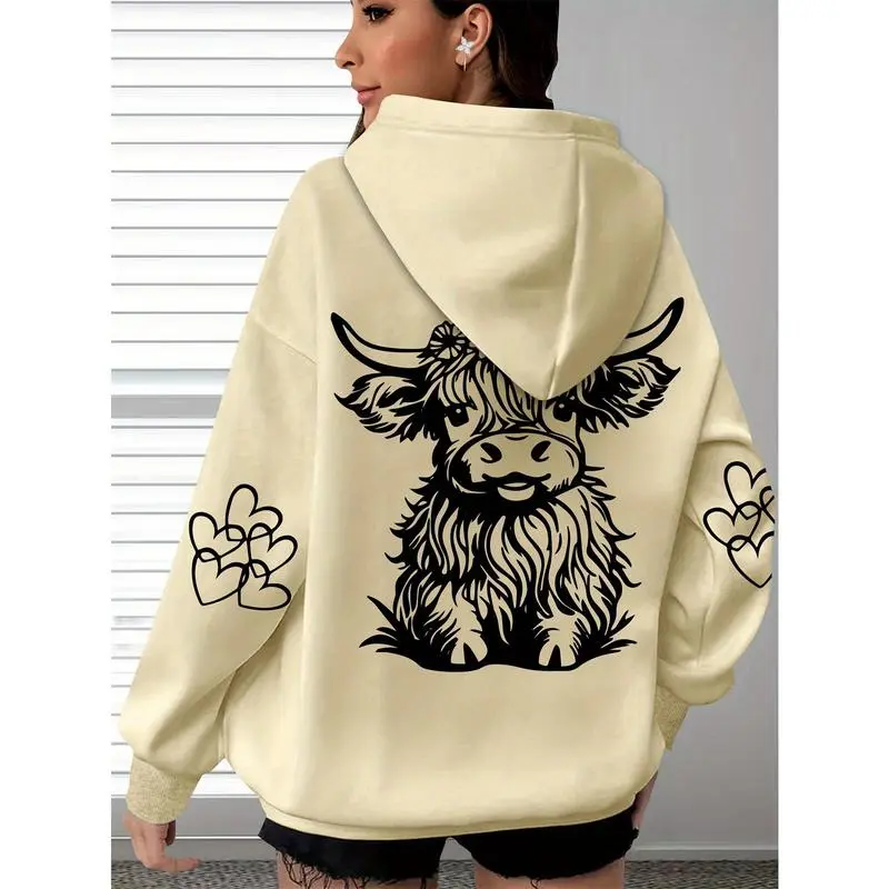 Women's Oversized Cozy Hoodie with Highland Cow Print & Paw Heart Design - Soft Long Sleeve Pullover, Brown Polyester Casual Wear for Everyday Comfort