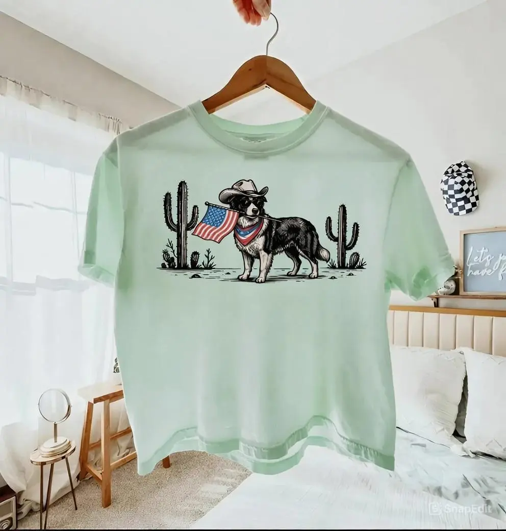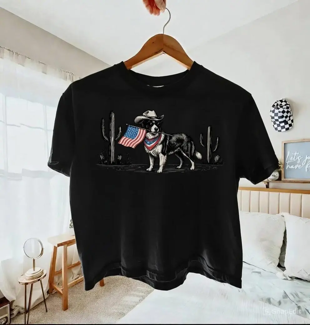 American Flag Dog Cowboy T-Shirt 2026 - Patriotic Border Collie Gift Shirt | Unisex Retro Top