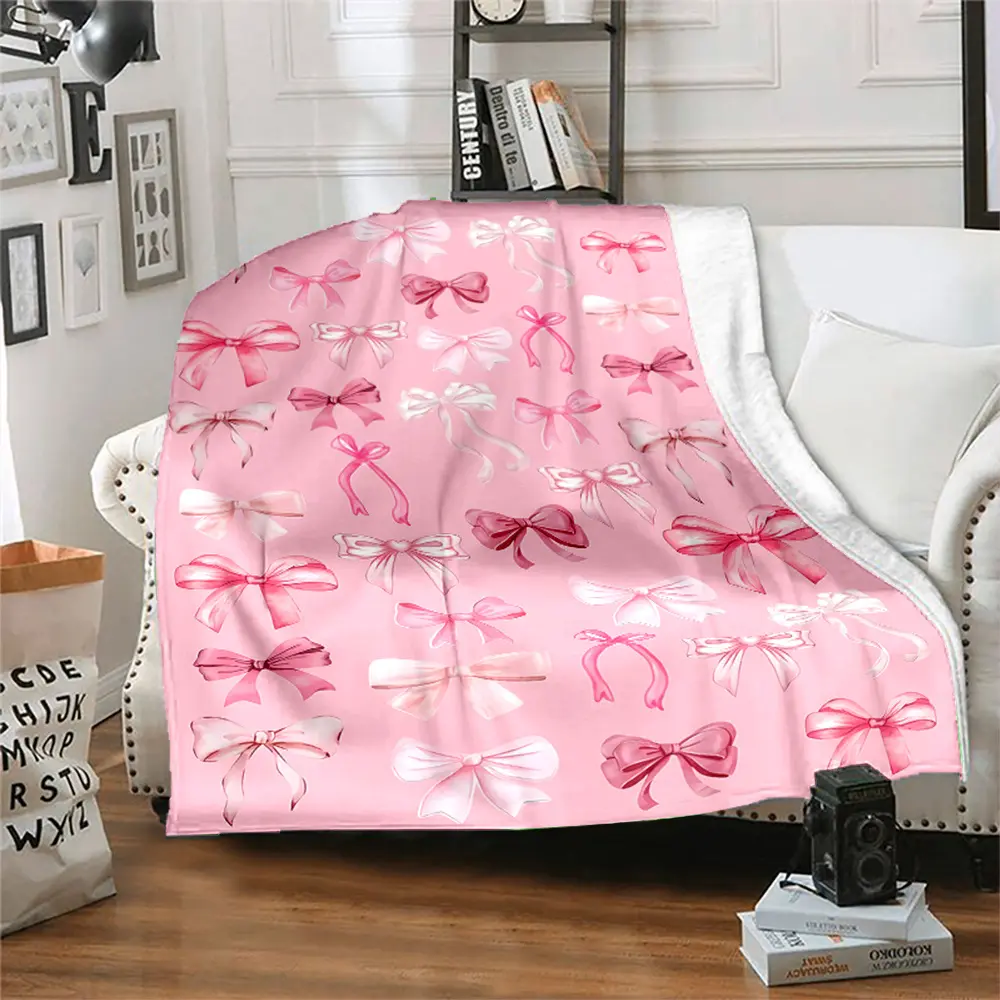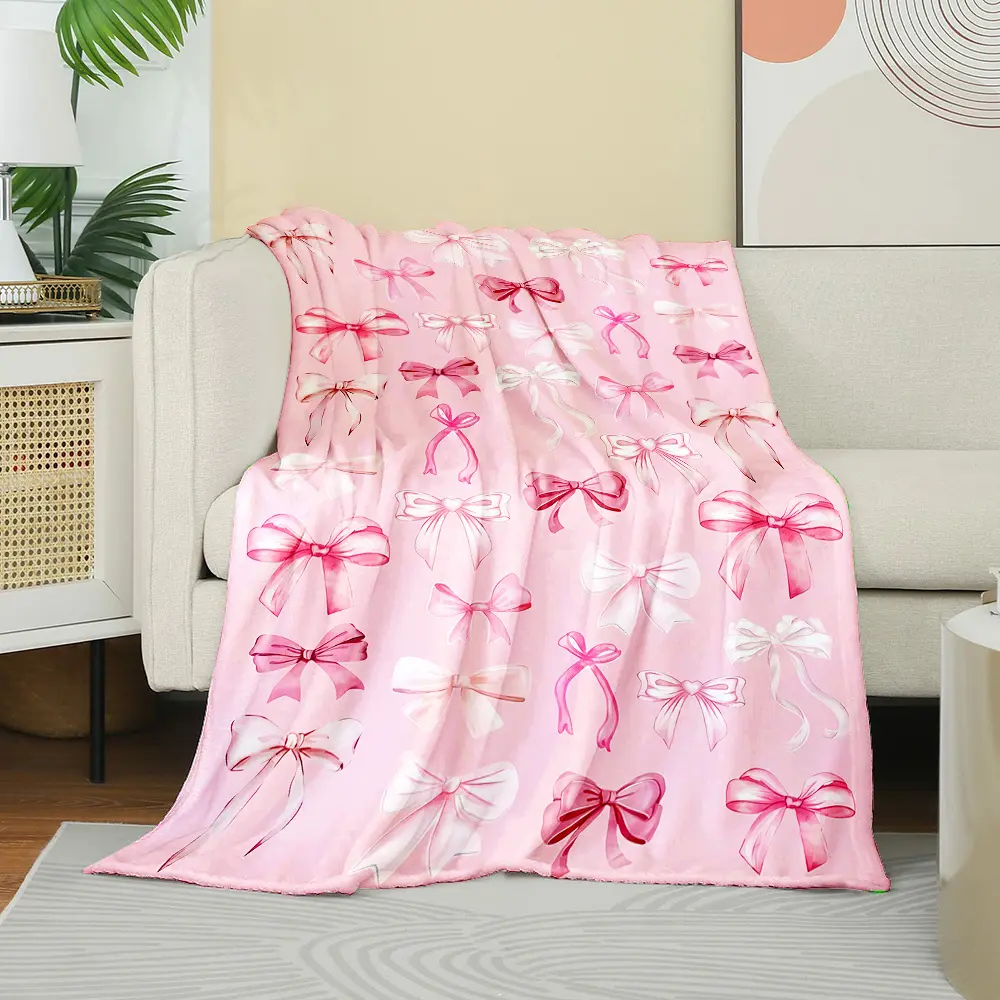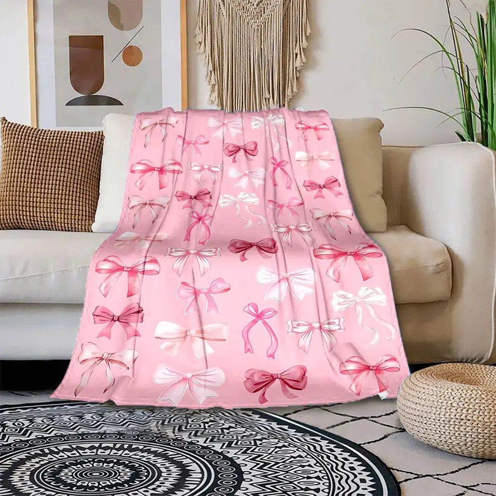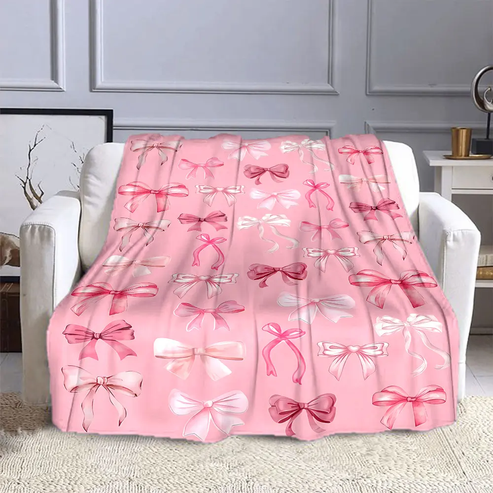[Pink Bow Print Flannel Blanket] Soft Pink Bow Print Flannel Throw Blanket - Cozy All-Season Comfort for Couch, Bed, Office, and Travel - Perfect Gift for Family and Friends-280GSM
