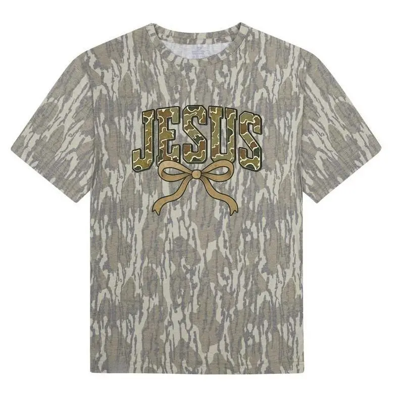 Mossy Oak Bottomland Vintage Jesus Bow Camo T-Shirt, Faith Hunting Graphic Tee, Christian Outdoor Style, Casual Streetwear Outfit, Gift Idea